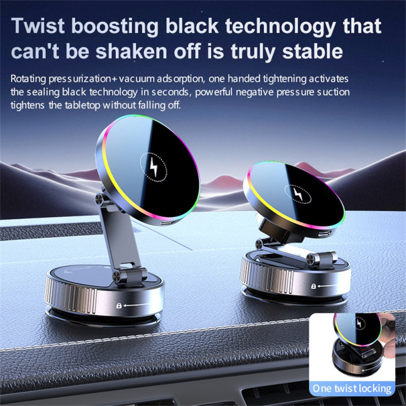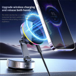 Soporte magnético para cargador inalámbrico de coche con rotación panorámica de 360°, carga rápida de 15 W y potente ventosa. Compatible con iPhone 12-17 y Android. Fácil instalación, fijación segura y construcción duradera para cuando estás en movimiento.