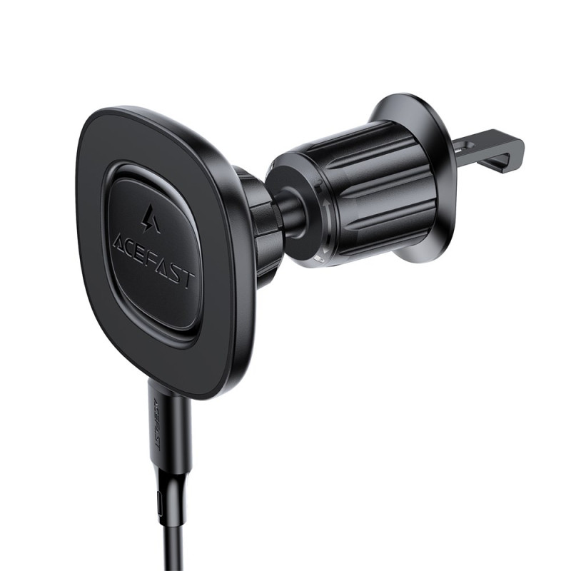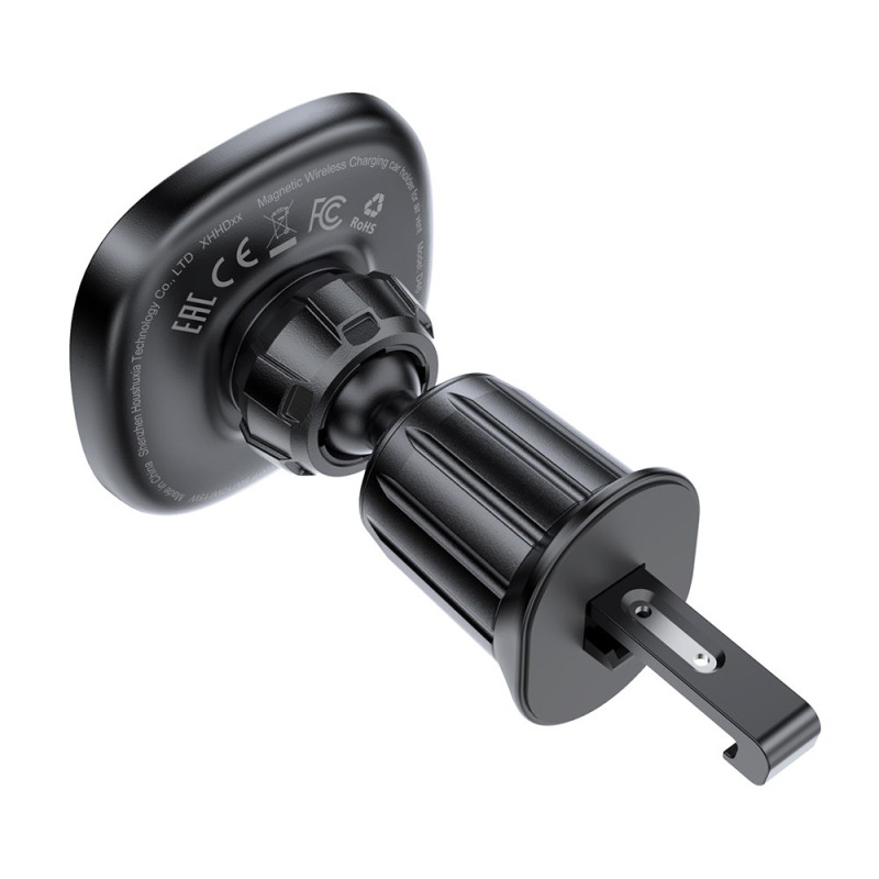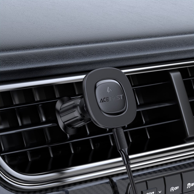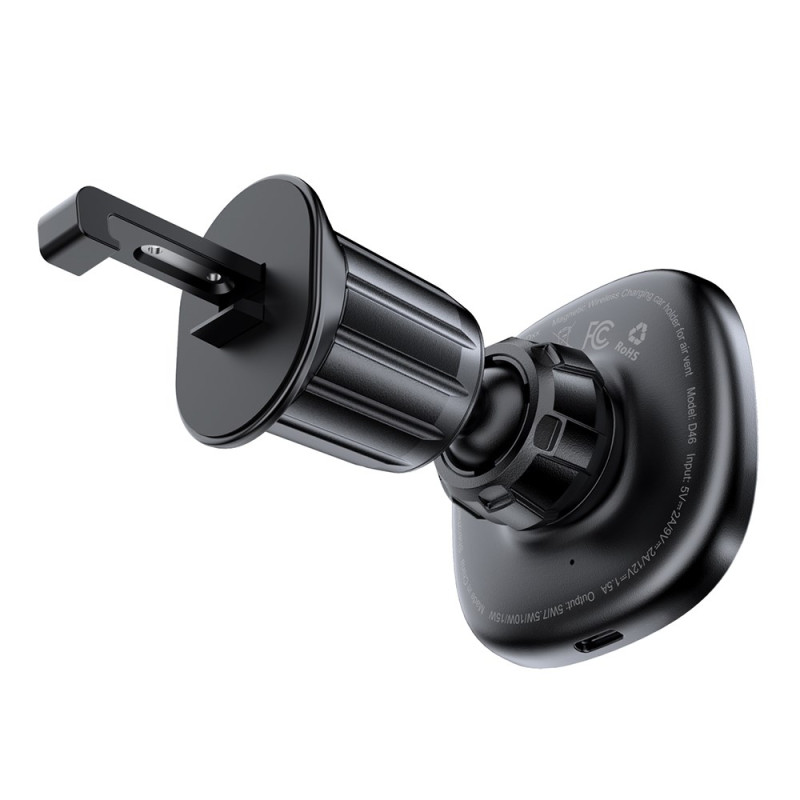 Cargador magnético inalámbrico para coche que ofrece una carga rápida de hasta 15 W. Se fija firmemente a la rejilla de ventilación con una superficie de silicona antideslizante. Compatible con smartphones de 4,7 a 6,9 pulgadas. Diseño elegante y minimalista.