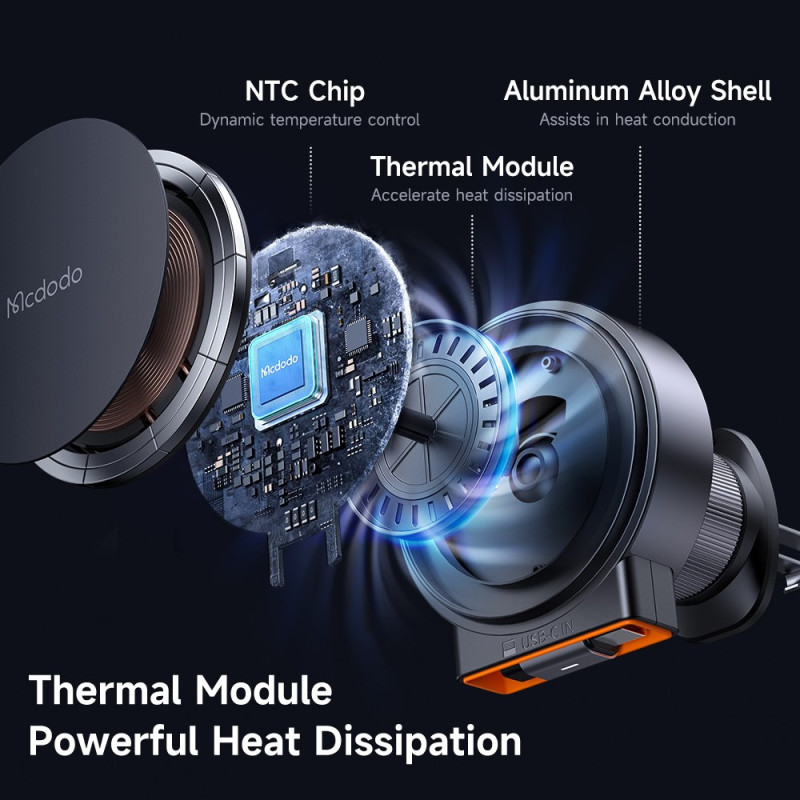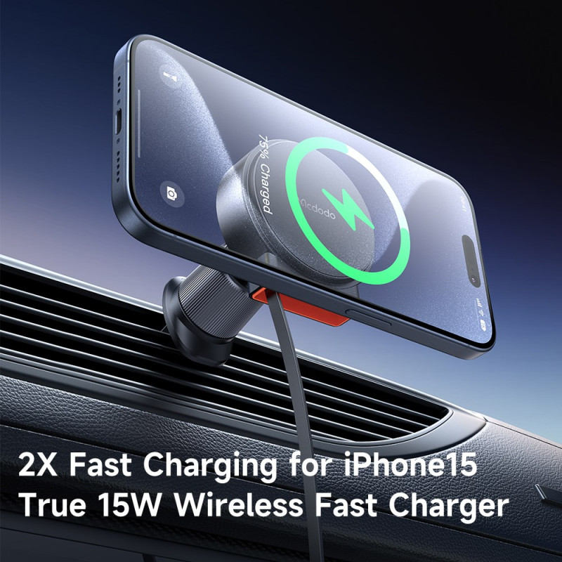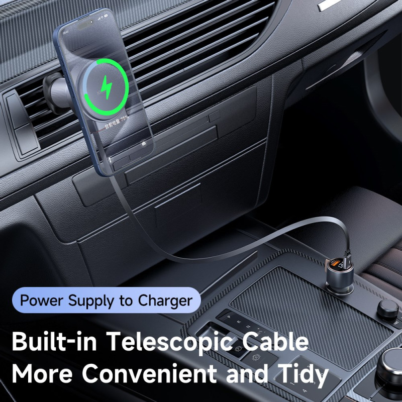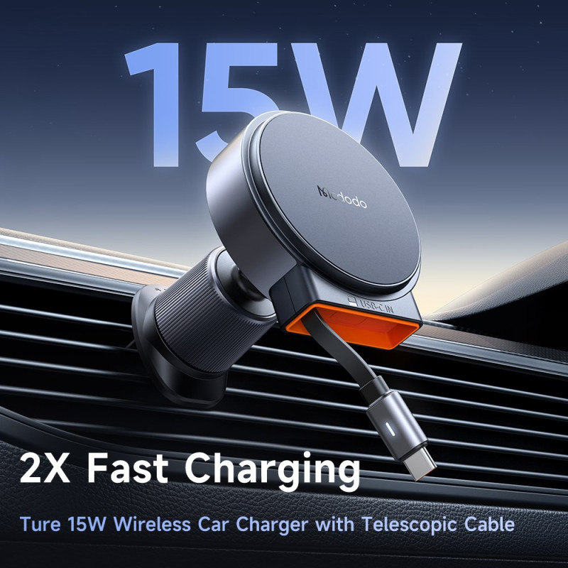 Cargador inalámbrico magnético de 15 W con cable USB-C retráctil de 1 m integrado. Compatible con iPhone 12-15 y Samsung. Doble bobina magnética para una fijación estable a las rejillas de ventilación. Carga rápida de 15W con protección total y certificaciones CE, FCC y UL....