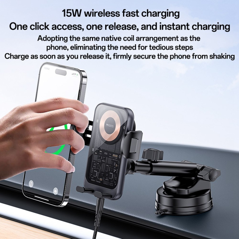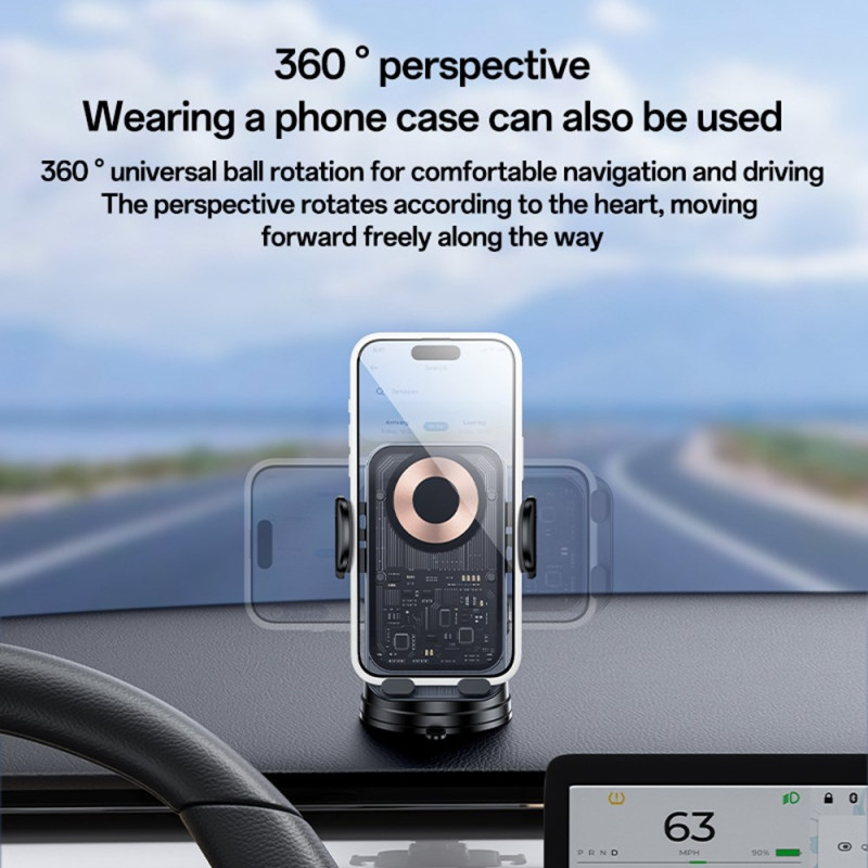 Transforma tu viaje con este soporte para smartphone con carga inalámbrica de 15 W. Con una práctica pinza automática, ventosa giratoria de 360° y potentes imanes para una fijación segura. Compatible con todos los dispositivos Qi para una carga rápida mientras conduces.