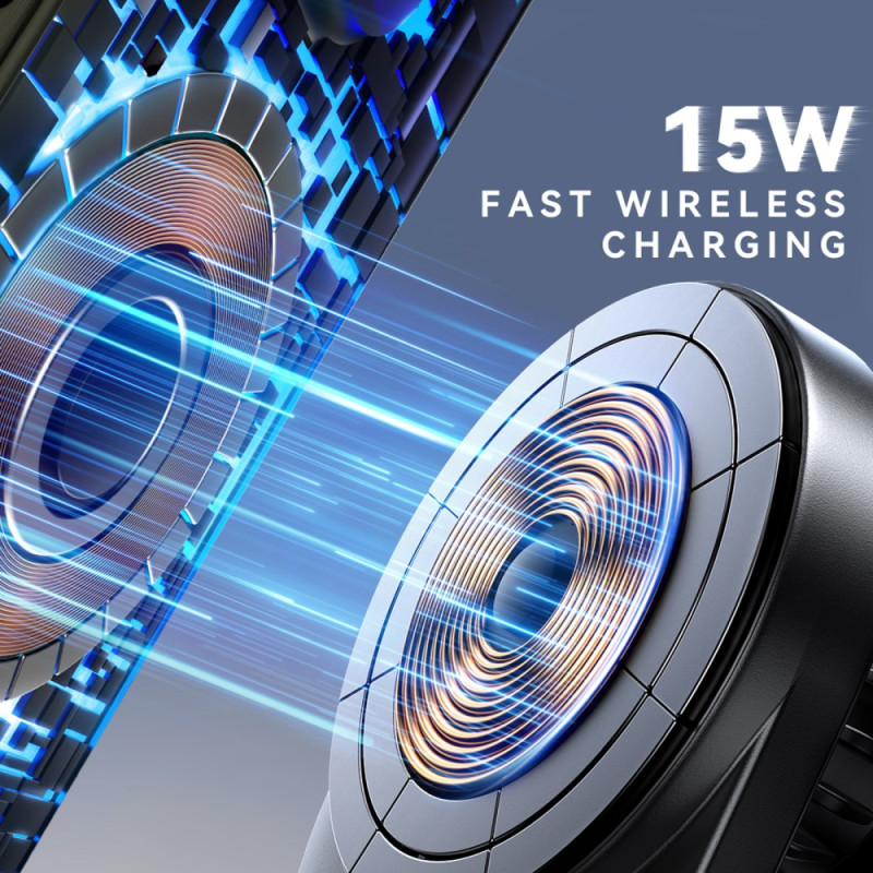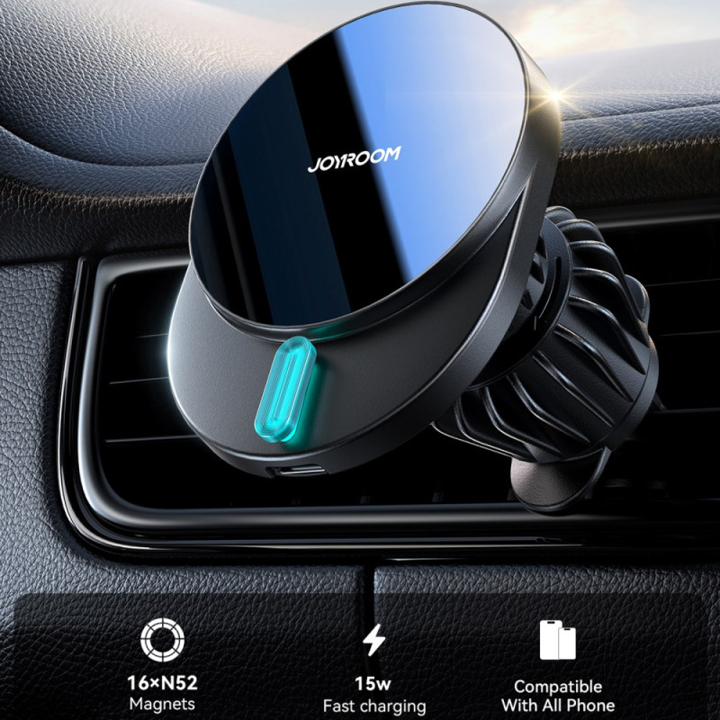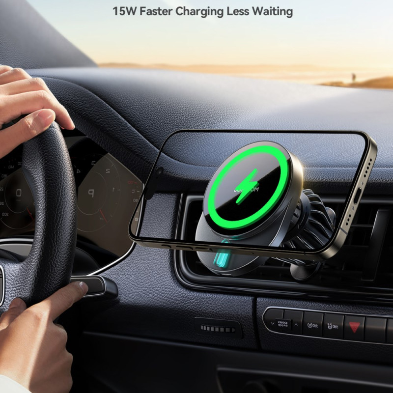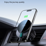 Carga tu smartphone con total seguridad con este soporte magnético inalámbrico de 15 W. Se fija con seguridad a una rejilla de ventilación, gira 360° y se alinea automáticamente para una carga rápida y eficiente. Se maneja con una sola mano para mayor comodidad.