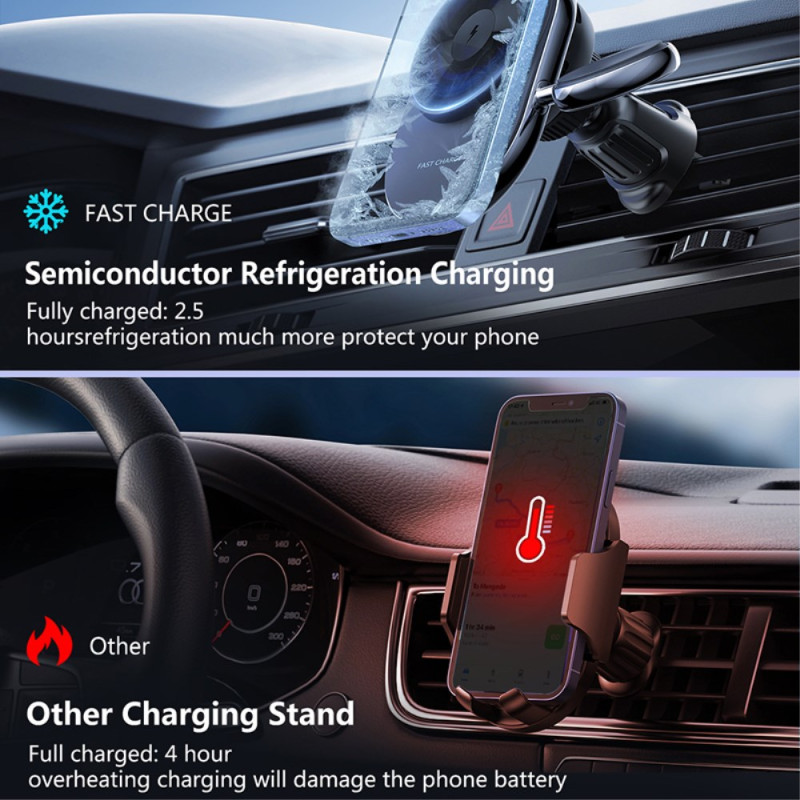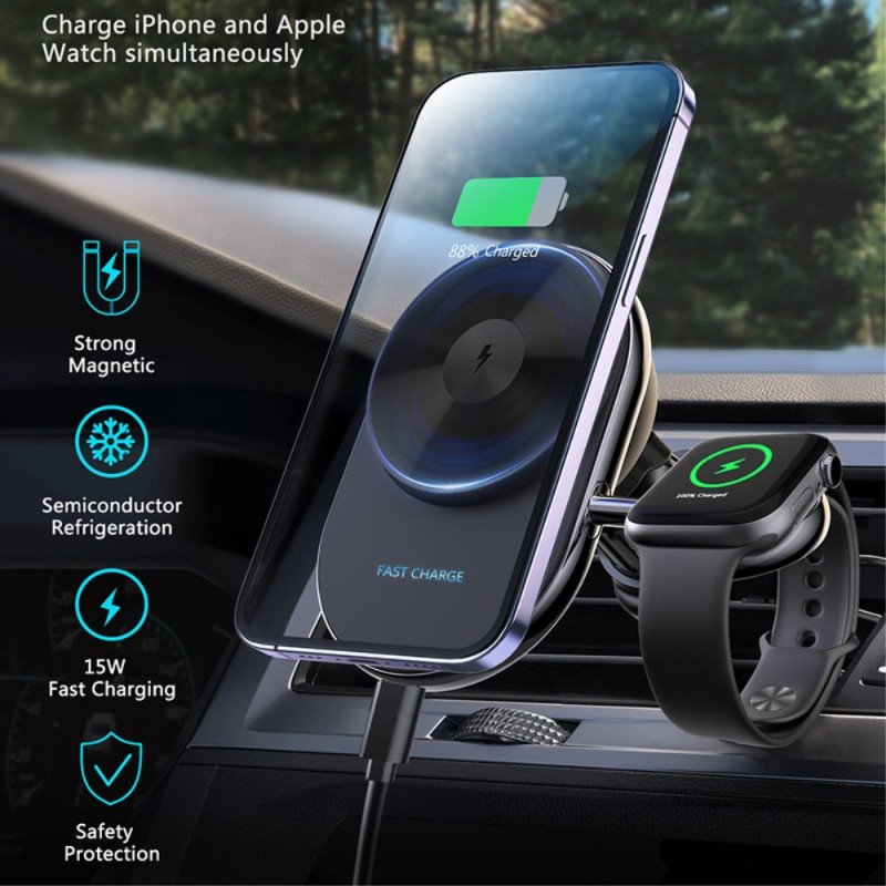Cargador inalámbrico magnético 2 en 1 con tecnología de refrigeración por semiconductores para iPhone y Apple Watch. Mejora notablemente la eficiencia de la carga: iPhone 14 totalmente cargado en 2,5 horas.