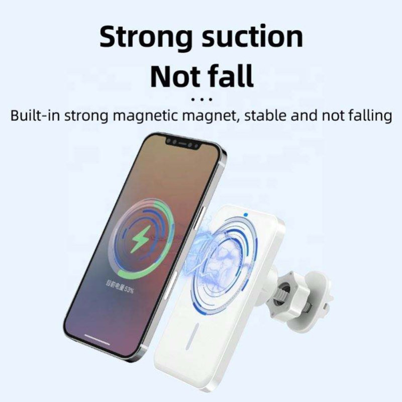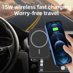 Soporte magnético para coche 2 en 1 con cargador inalámbrico rápido de hasta 15 W. Se fija firmemente a la rejilla de ventilación y gira 360° para ofrecer un ángulo de visión óptimo. Ideal para navegación GPS y llamadas mientras conduces.