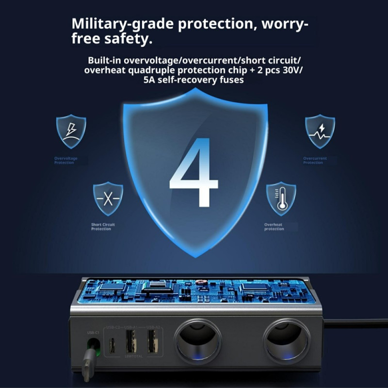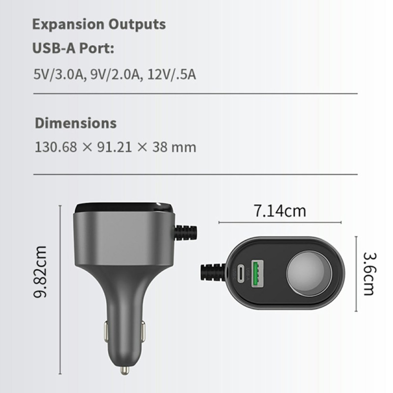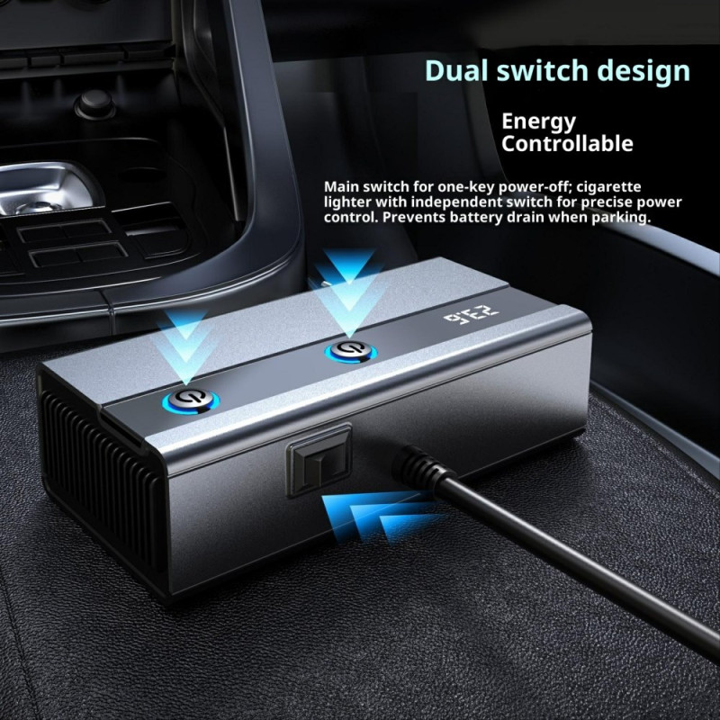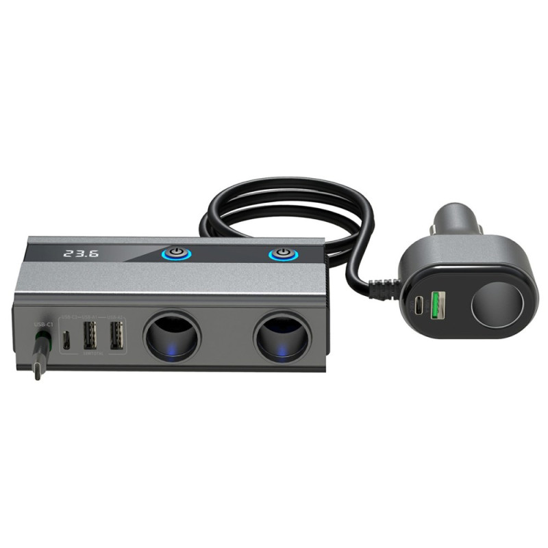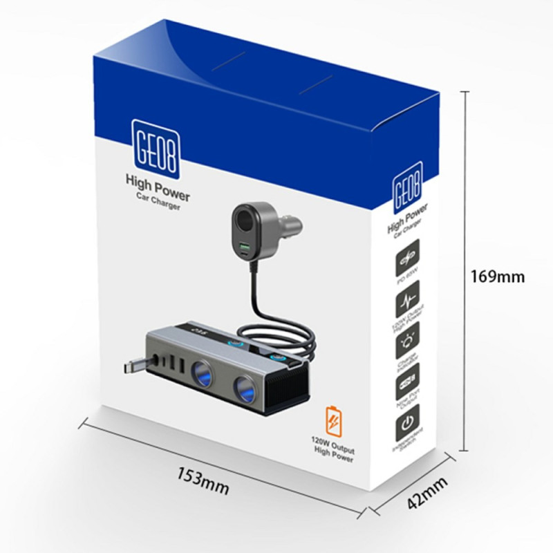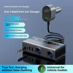 Cargador de coche multipuerto 9 en 1 de 120 W con cable retráctil de 78 cm y carga rápida PD de 65 W. Interruptores dobles para un control preciso de la potencia. Compatible con todos los vehículos de 12V-24V.
