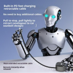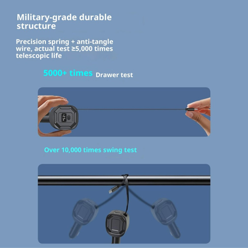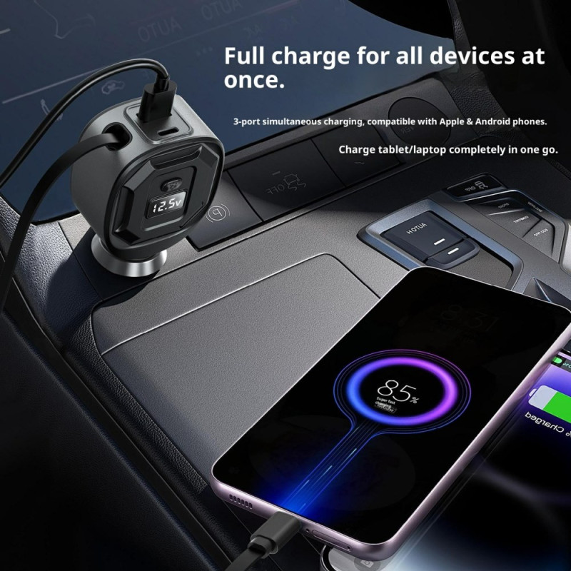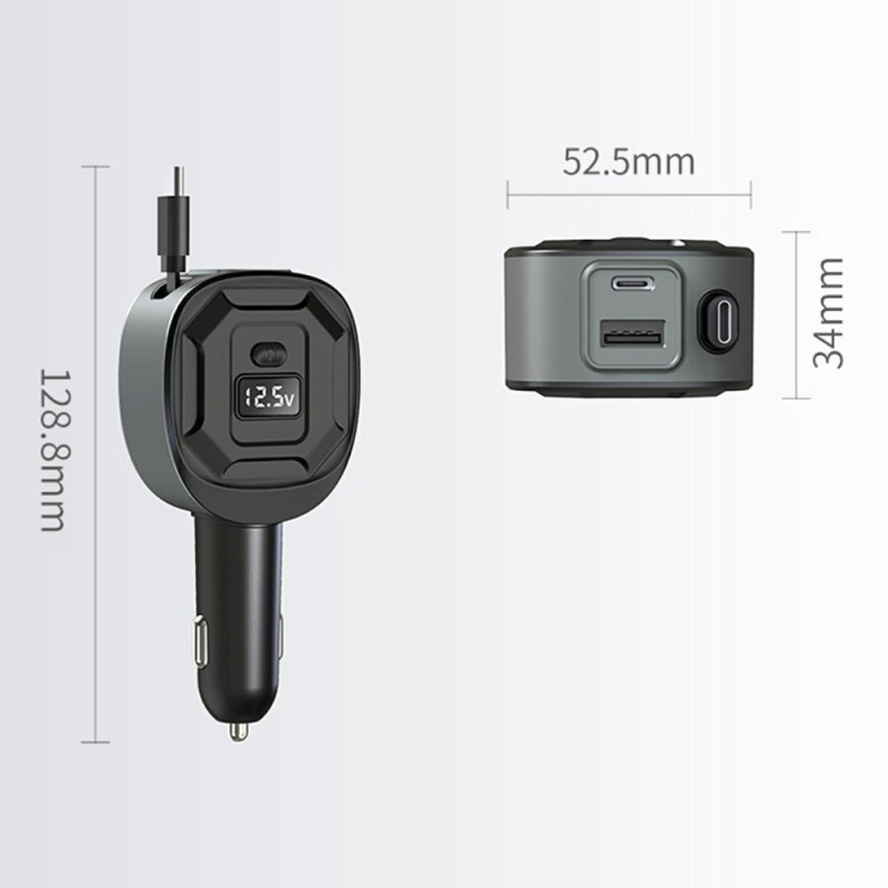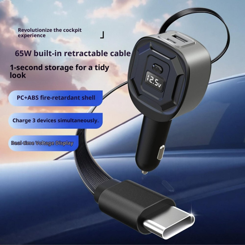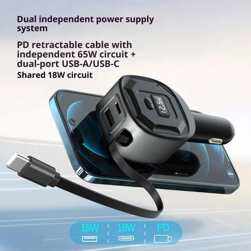 Cargador de coche de alto rendimiento con dos puertos de carga rápida (65 W PD + 18 W USB-A) y cable retráctil de 78 cm. Indicador LED del voltaje de la batería en tiempo real para una carga segura. Compatible con todos los vehículos de 12V-24V.