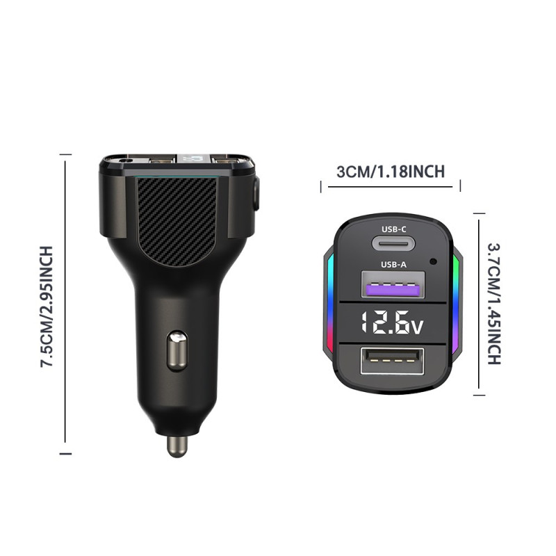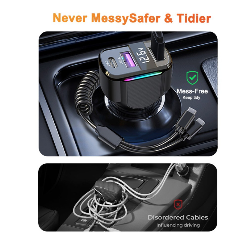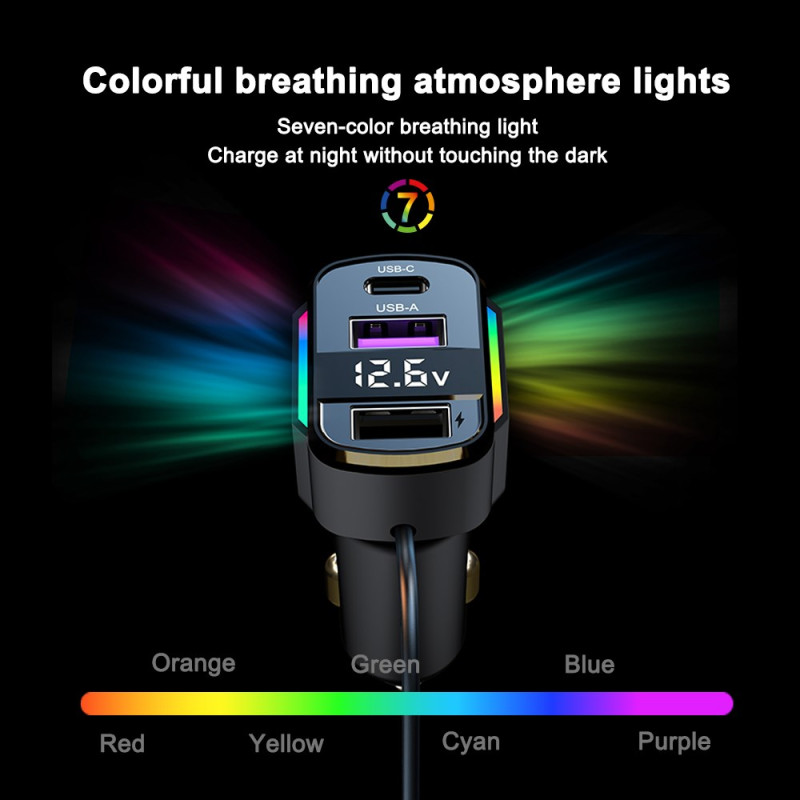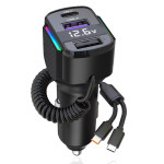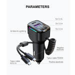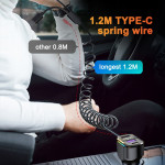 Cargador de coche de alto rendimiento con carga rápida PD de 30 W y cable espiral Type-C de 1,2 m. Luz LED de colores para localizarlo fácilmente en la oscuridad. Compatible con todos tus dispositivos: iPhone, Samsung, Xiaomi, Huawei y tablets.