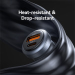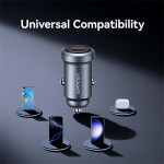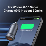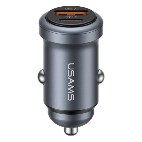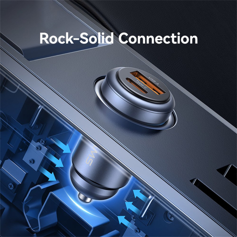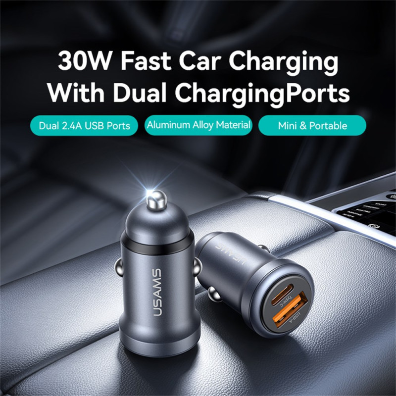 Cargador de coche ultracompacto de 30 W con dos puertos USB-A y USB-C para una carga rápida y versátil. Su diseño en miniatura y su robusta construcción garantizan una óptima disipación del calor. Compatible con todos tus dispositivos digitales.
