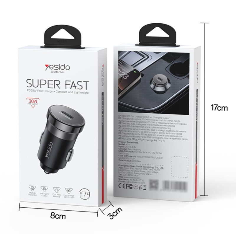 Descubre la carga ultrarrápida de 30 W con el YESIDO Y74. Compatible con todos tus dispositivos gracias a los protocolos PD3.0, PPS y QC3.0. Diseño compacto y elegante, perfecto para cuando estás en movimiento. Construcción robusta para una máxima durabilidad. Apto para todos los vehículos con entrada de 12-24 V.