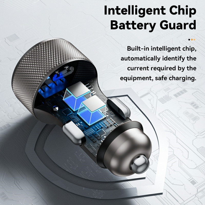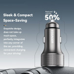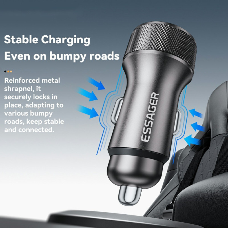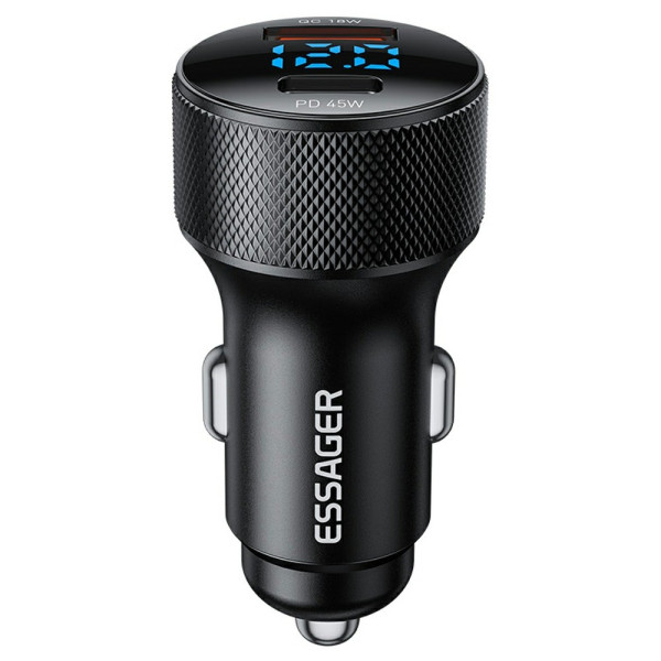 Cargador rápido para coche ESSAGER con puertos USB-A y Type-C duales que ofrecen hasta 45 W de potencia. Compatible con PD3.0 y QC3.0 para una carga ultrarrápida de tus dispositivos. Indicador LED de potencia en tiempo real y chip inteligente para una protección óptima.