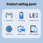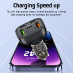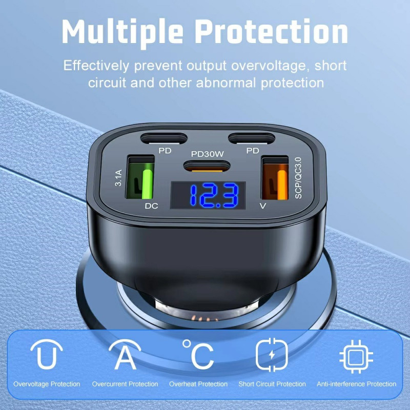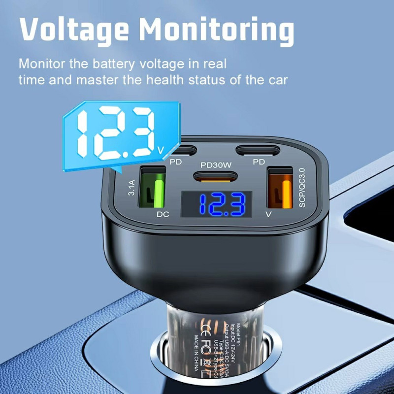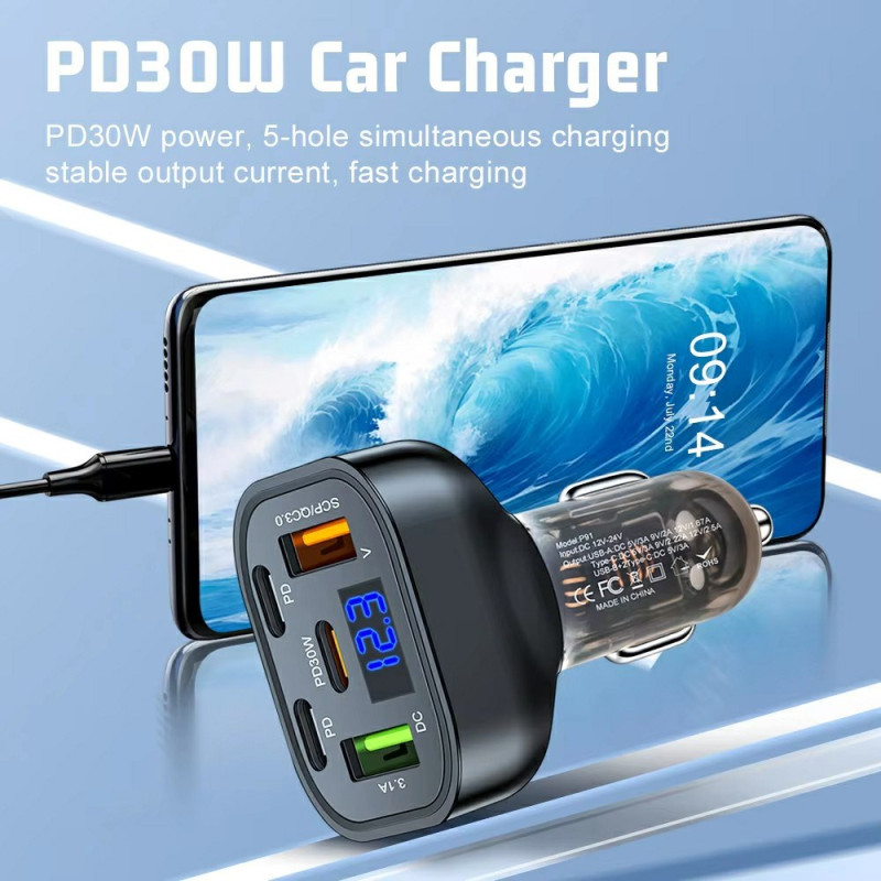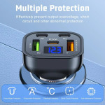 Cargador de coche de 150 W de alto rendimiento con 5 puertos (3 Type-C + 2 USB) y tecnología de carga rápida QC3.0 PD. Incorpora un chip inteligente de doble núcleo y visualización de voltaje en tiempo real para una carga óptima de todos tus dispositivos.