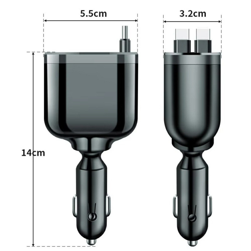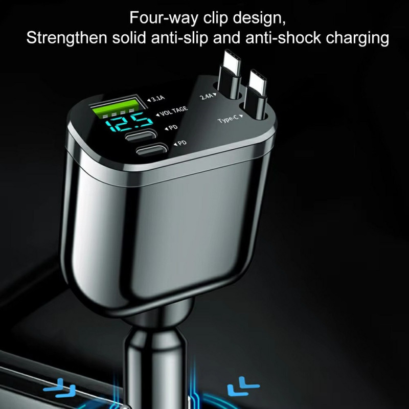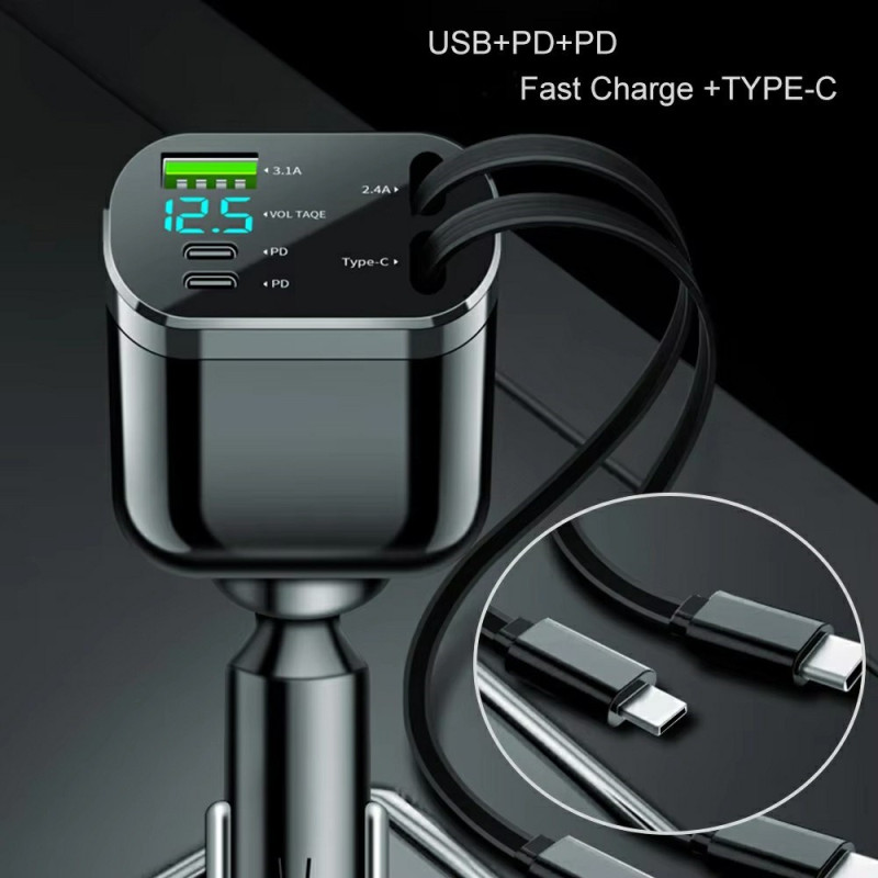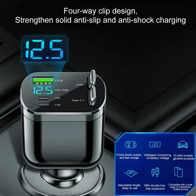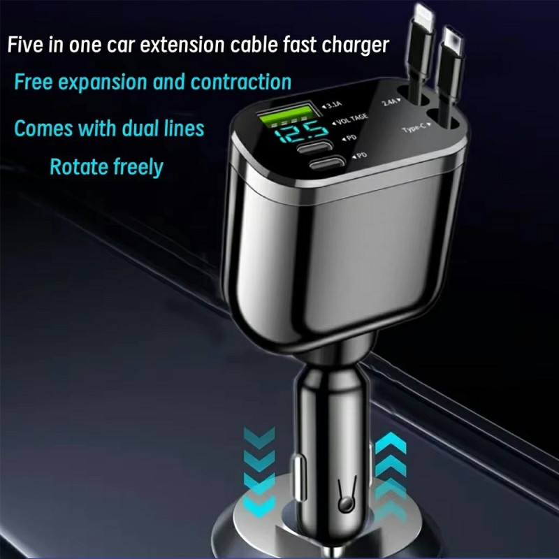 Carga hasta 5 dispositivos simultáneamente con este cargador inteligente para coche. Cuenta con tecnología de carga rápida PD, pantalla LED digital y 2 prácticos cables retráctiles. Protección multicapa integrada para una seguridad óptima.