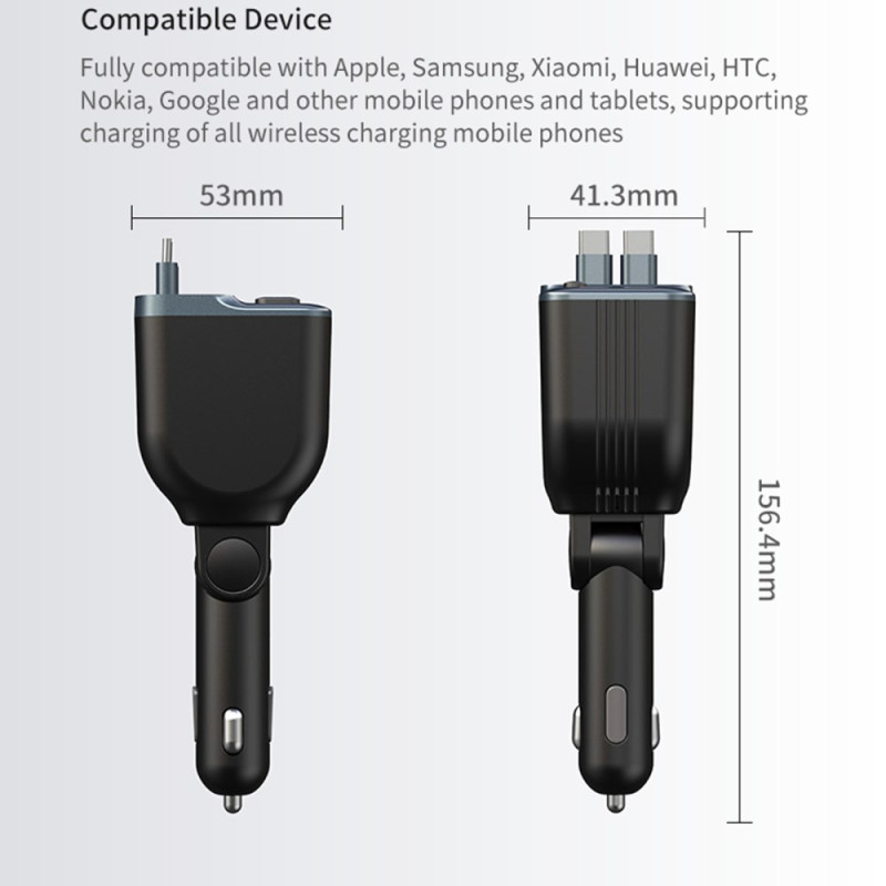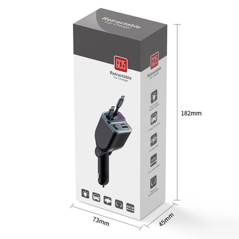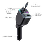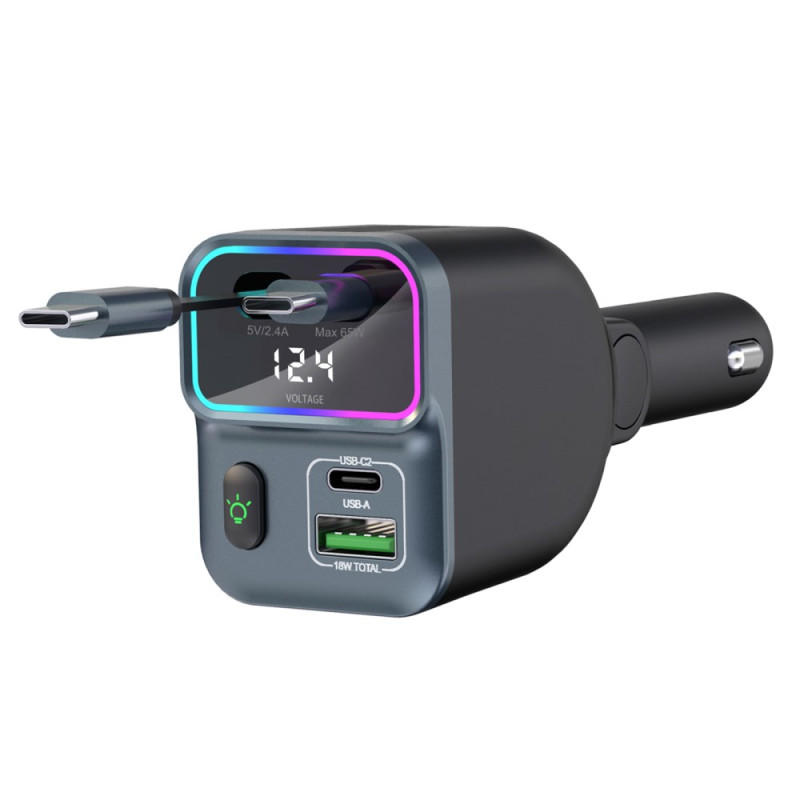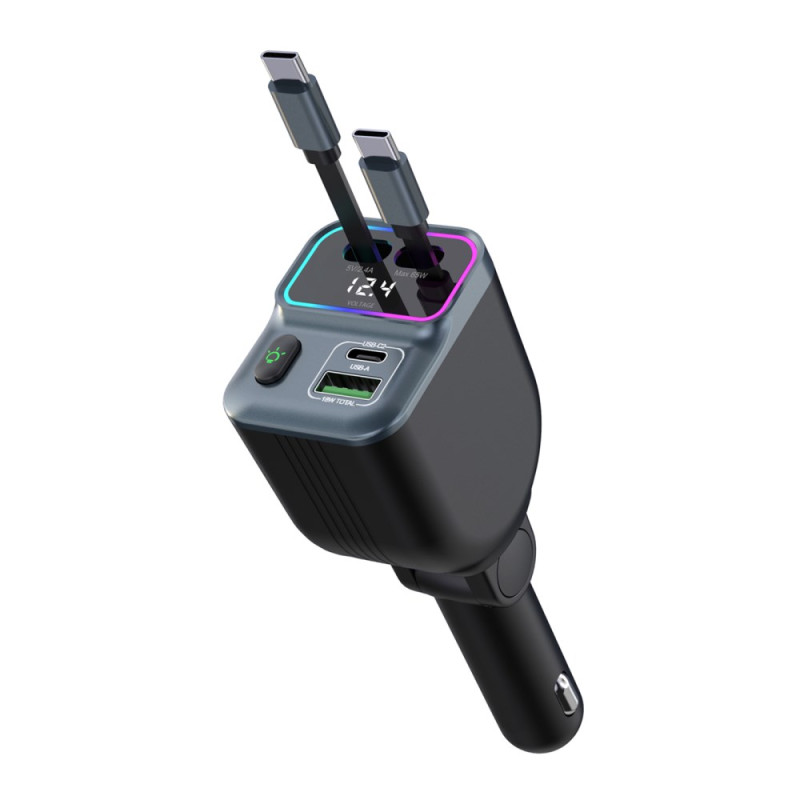 Cargador de coche de alto rendimiento con dos cables USB-C retráctiles integrados y monitor de voltaje en tiempo real. Potencia combinada de 83 W para una carga rápida y simultánea de tus dispositivos. Compatible con todos los smartphones y vehículos de 12 V/24 V.