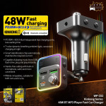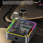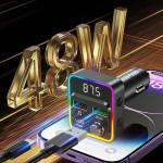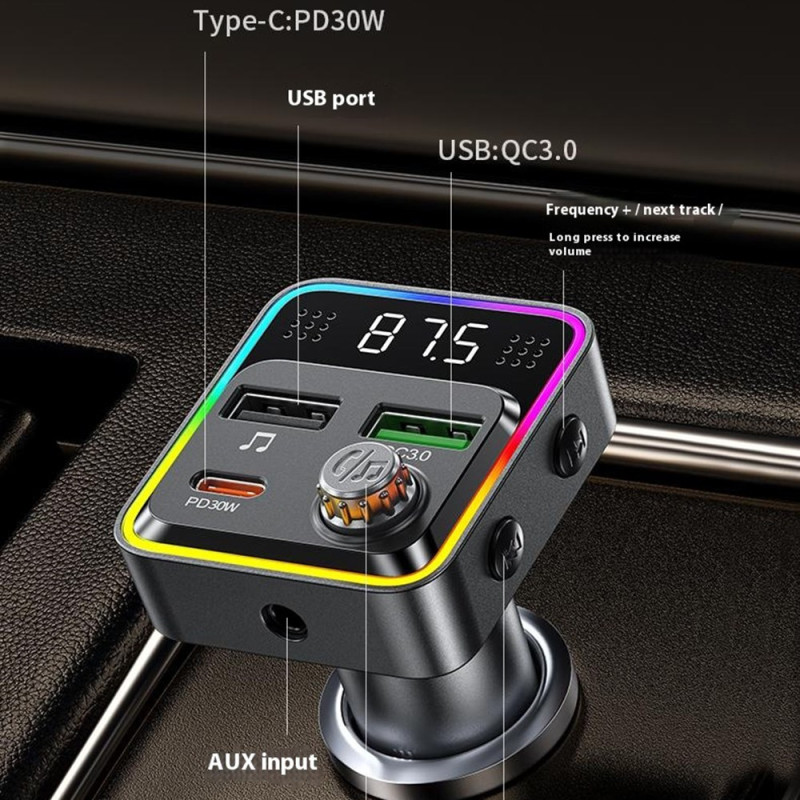 Cargador de coche inteligente de 48 W con dos puertos de carga rápida (PD30W + QC3.0), reproductor MP3 integrado e iluminación ambiental de 7 colores. Disfruta de llamadas manos libres por Bluetooth y de una carga óptima para todos tus dispositivos. Compatible con 12 V-24 V.