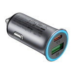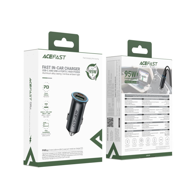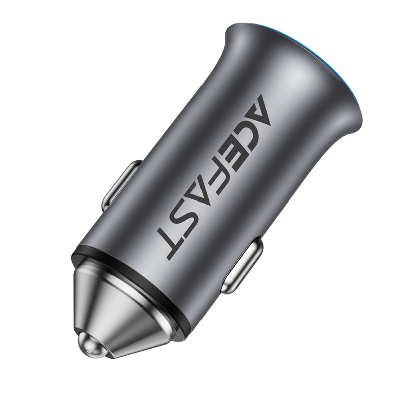 Cargador de coche ultrapotente de doble puerto que ofrece hasta 95 W de potencia combinada. Disfruta de carga rápida simultánea mediante USB-C (65 W) y USB-A (30 W). Diseño compacto y elegante con anillo de luz azul hielo para dar un toque de ambiente.