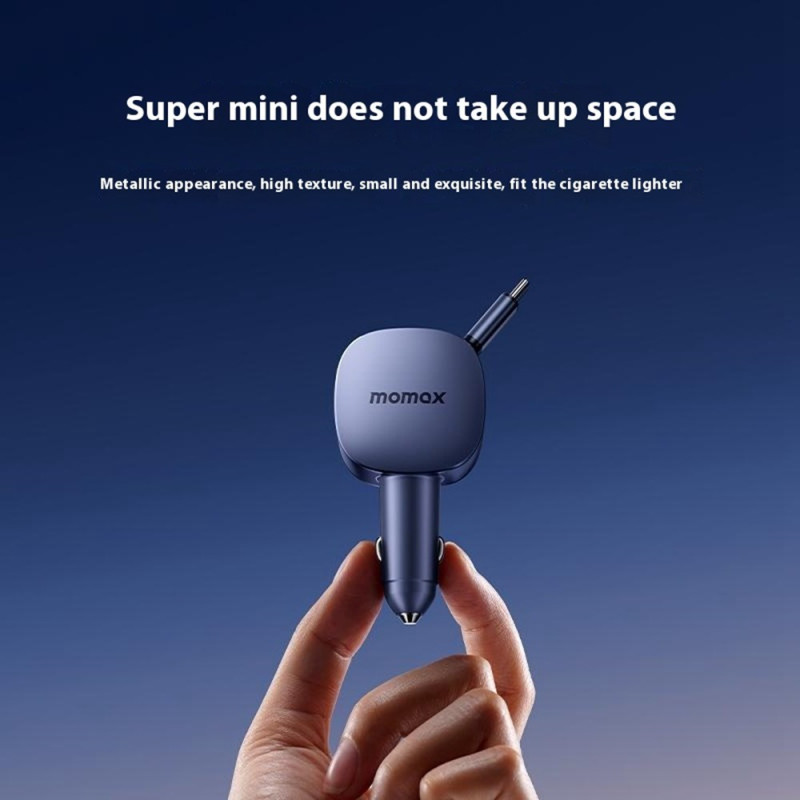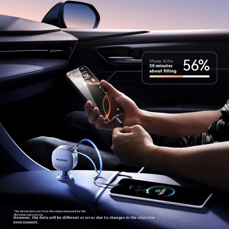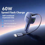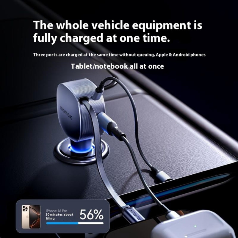Cargador de coche de 60 W con cable retráctil integrado de 72 cm. Carga rápida simultánea de hasta 3 dispositivos (smartphones, tablets, portátiles). Compatible con PD/QC/PPS y el 90% de los vehículos de 12-24 V. Protección inteligente contra sobretensiones.