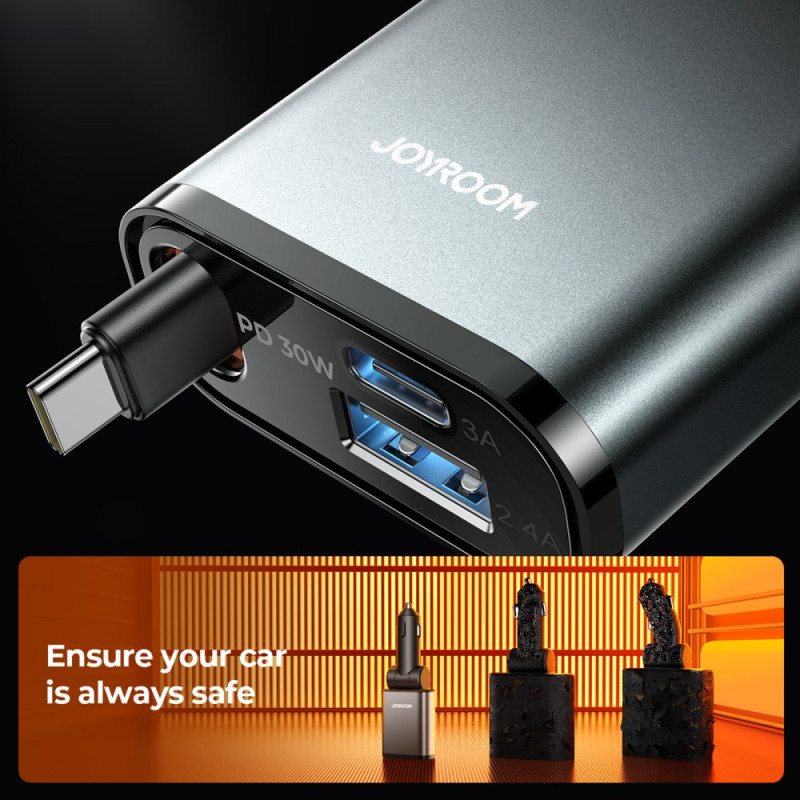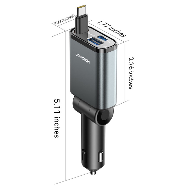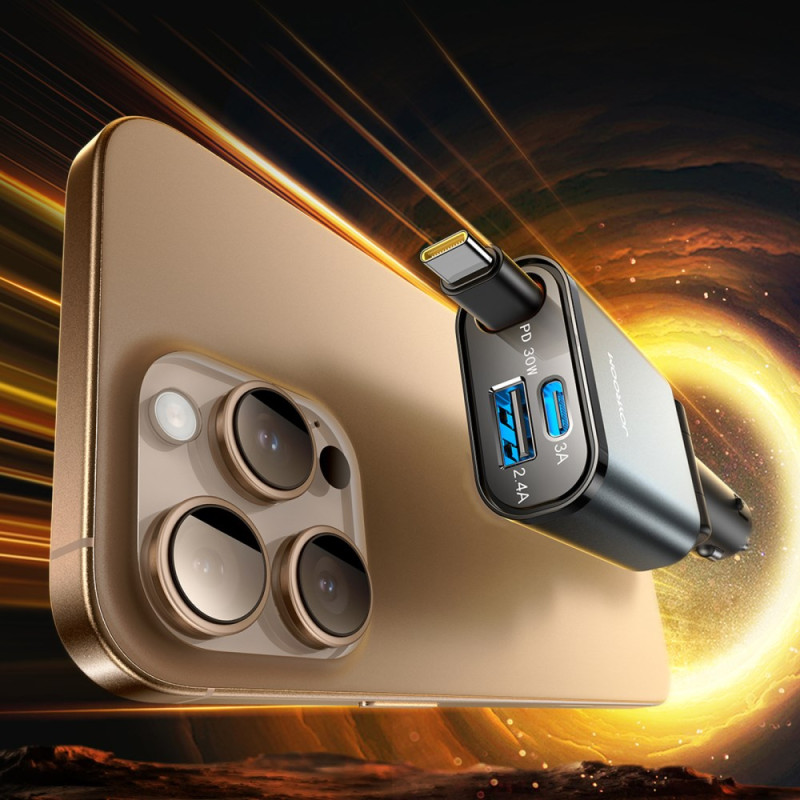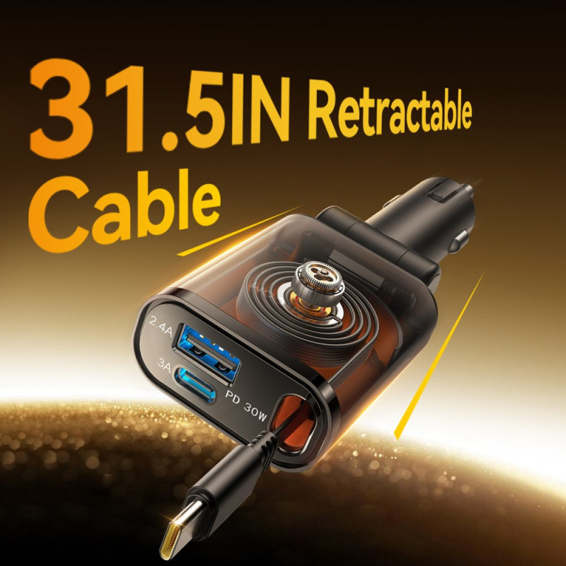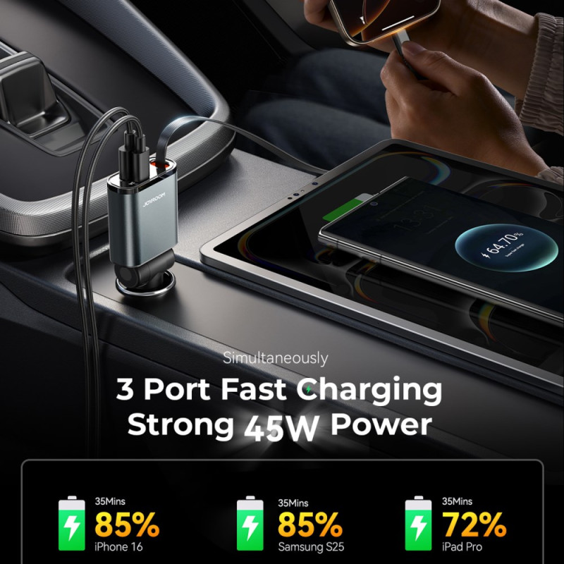 Cargador de coche ultrapotente de 45 W con cable Type-C retráctil integrado de 80 cm. Carga hasta 3 dispositivos simultáneamente gracias a los puertos USB-C y USB-A adicionales. Compatible con todos los protocolos de carga rápida (PD3.0, QC4, PPS). Diseño compacto y portátil...