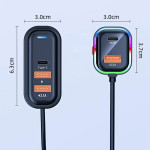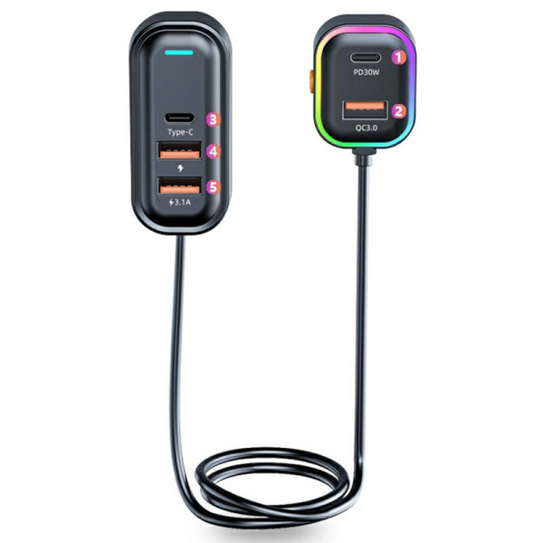 Convierta su coche en una estación de carga versátil. Este cargador multipuerto ofrece carga rápida de 30 W PD y QC 3.0 para todos sus dispositivos. Con su cable alargador de 1 m y su elegante iluminación ambiental, podrás cargar hasta 5 dispositivos simultáneamente desde los asientos delanteros y traseros.