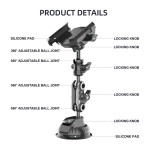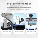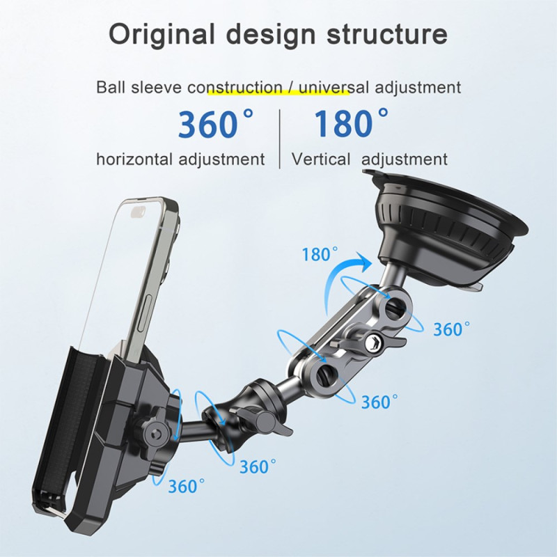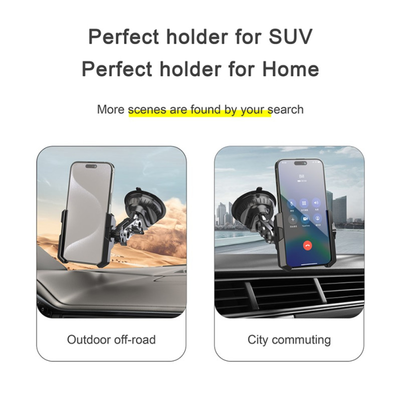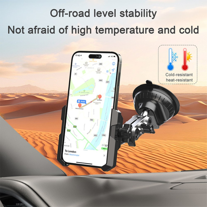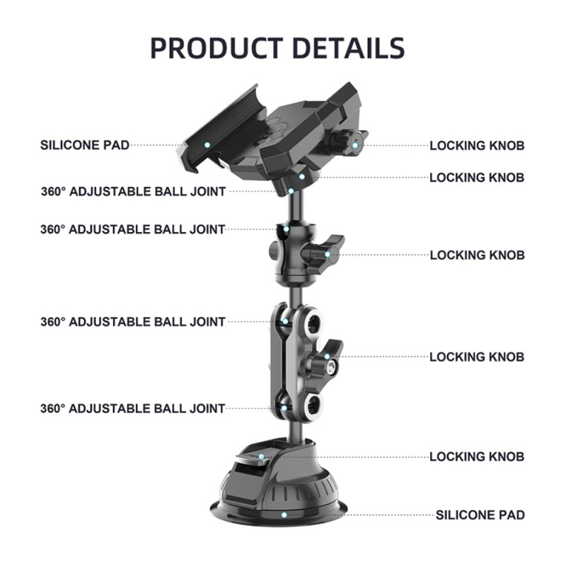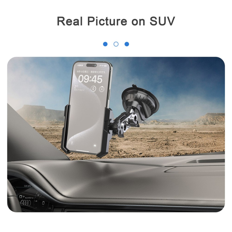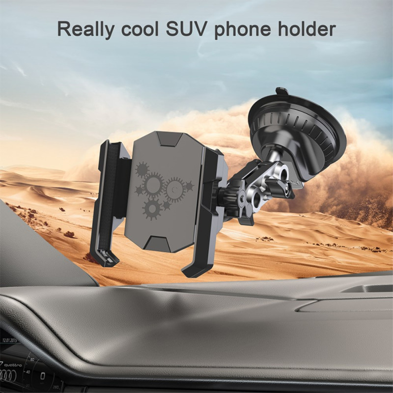 Soporte universal para teléfono con potente ventosa para parabrisas y salpicadero. Rótula ajustable 360° para un ángulo de visión óptimo. Base con triple refuerzo para una máxima estabilidad, incluso en carreteras en mal estado. Compatible con smartphones de 4,7 a 7,2 pulgadas.