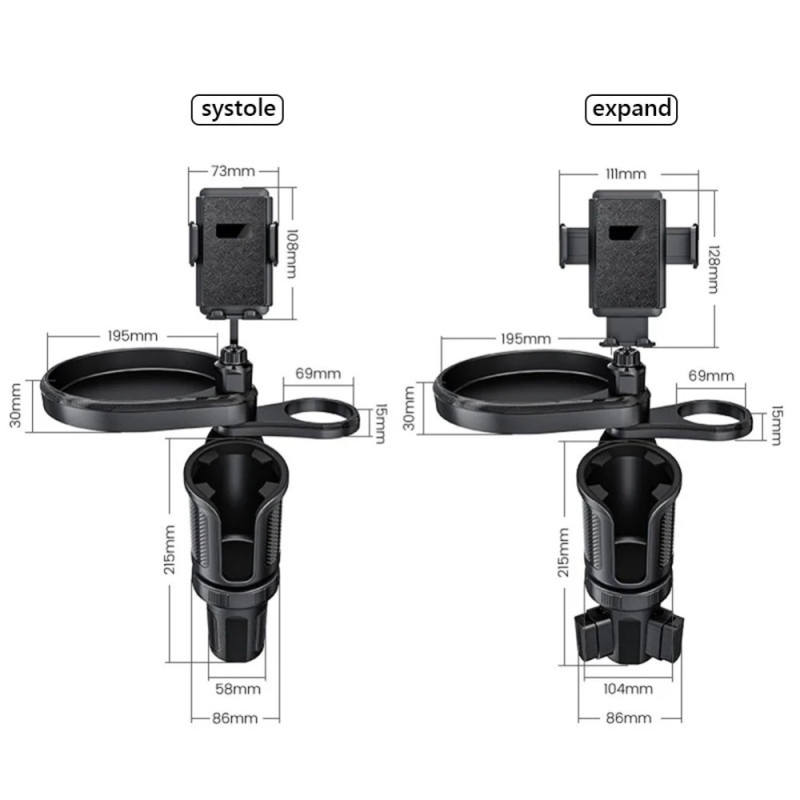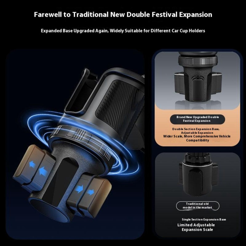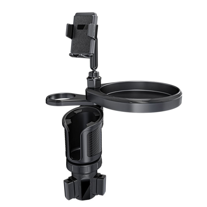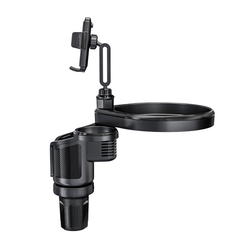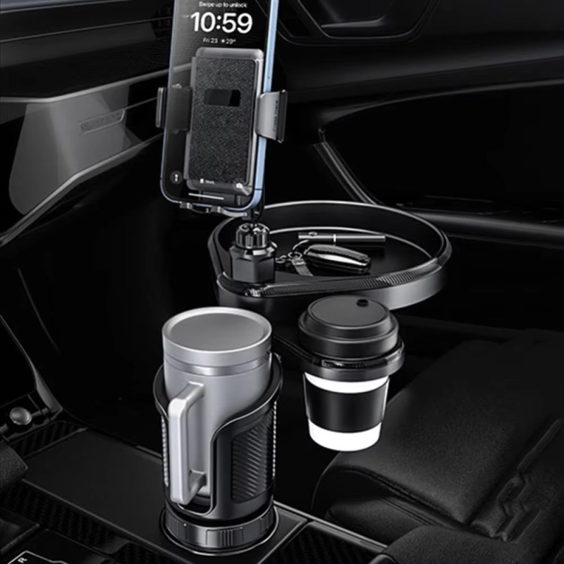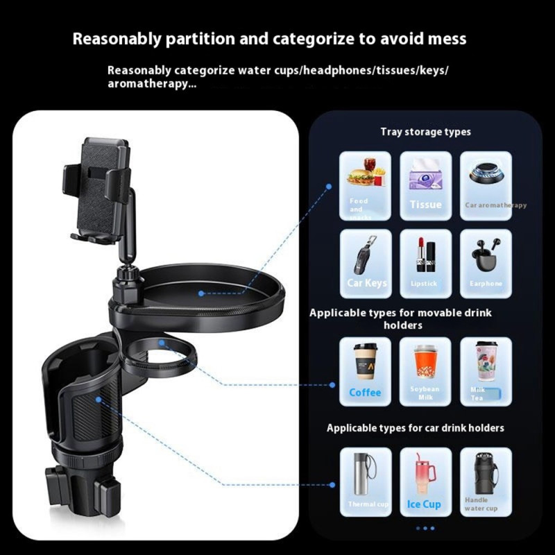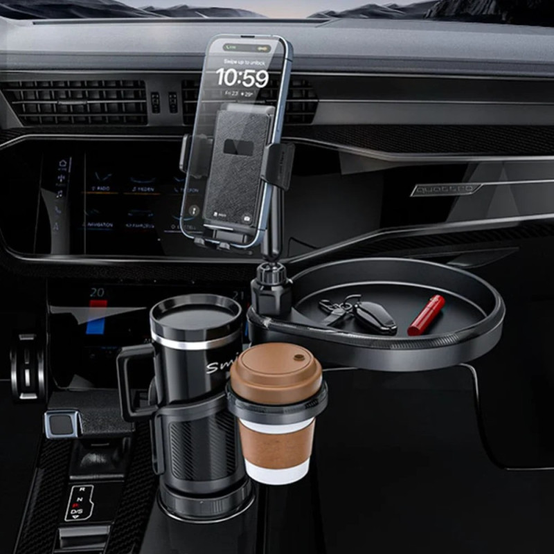Convierta su portavasos en una estación multifunción. Este soporte universal 4 en 1 combina un soporte giratorio de 360° para el teléfono, una bandeja de almacenamiento y un portavasos doble. Fácil instalación con un simple giro, compatible con la mayoría de vehículos.