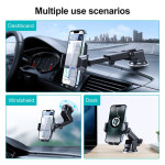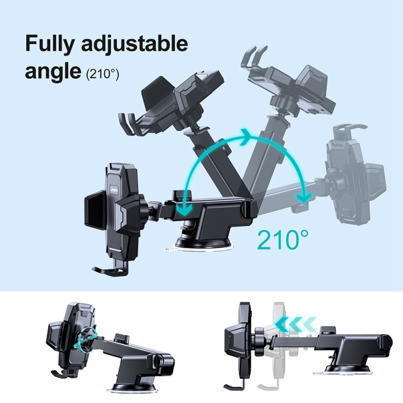 Soporte de coche ultraversátil con ventosa y ángulo ajustable de 360°. Compatible con smartphones de 4" a 7". Instalación universal en salpicadero, parabrisas o rejilla de ventilación para una conducción segura.