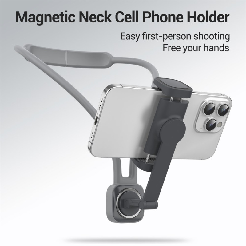 Herramienta creativa modular por excelencia, este soporte magnético es adecuado tanto para grabaciones en movimiento como estáticas. Su diseño POV con banda para el cuello permite una grabación inmersiva con manos libres. Para una mayor estabilidad, se incluye un minitrípode, lo que lo hace ideal para selfies de grupo y tomas fijas. El collar flexible recubierto de silicona garantiza un ajuste cómodo sin causar dolor. El sistema de fijación magnética permite colocar y quitar el teléfono rápidamente. Es compatible con todos los smartphones (6-11 cm de ancho).