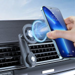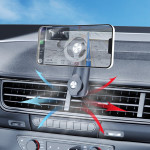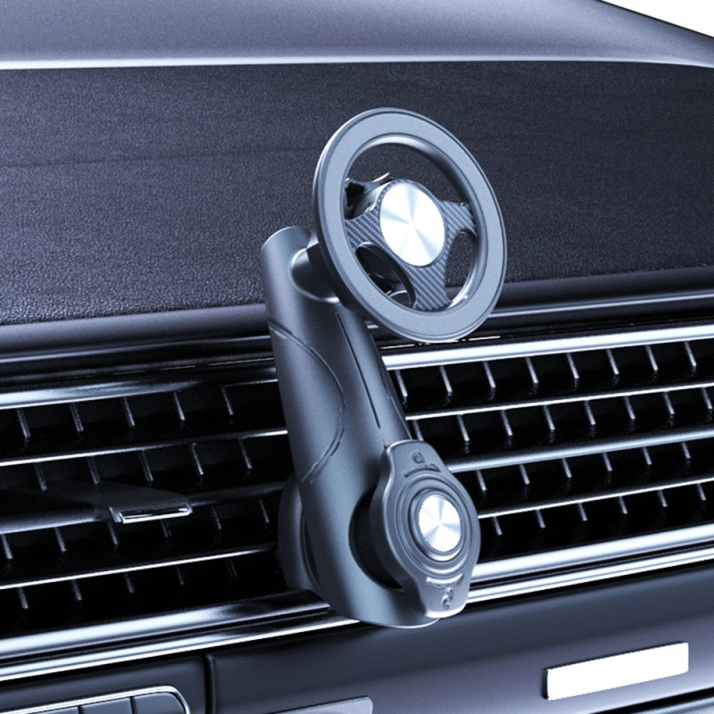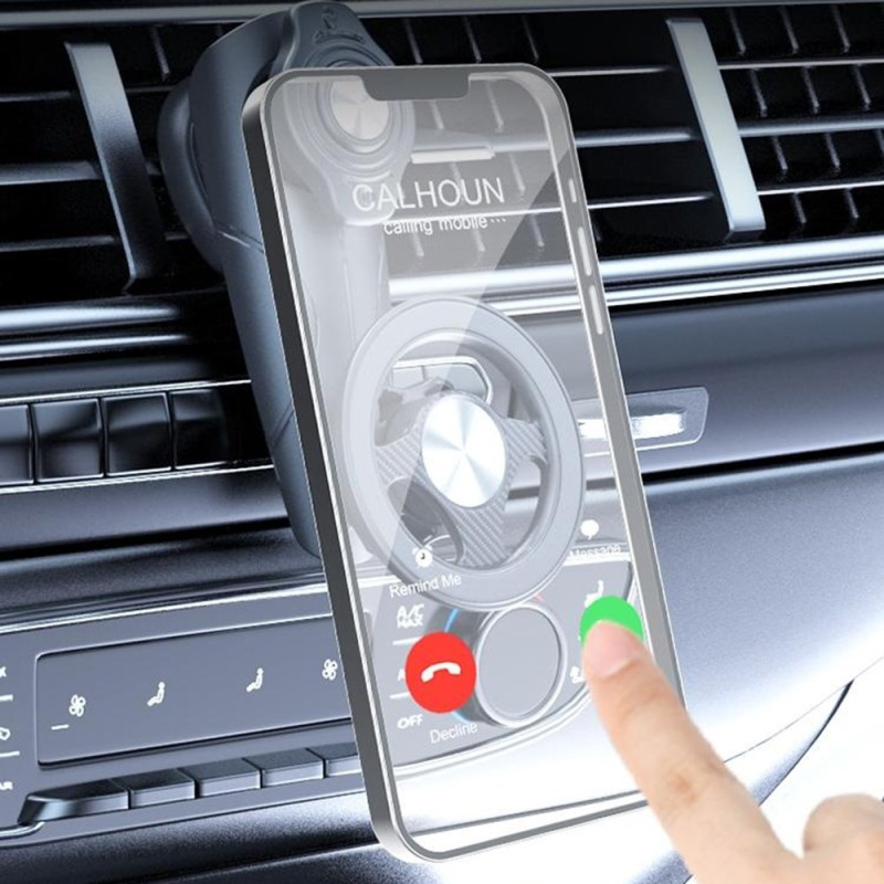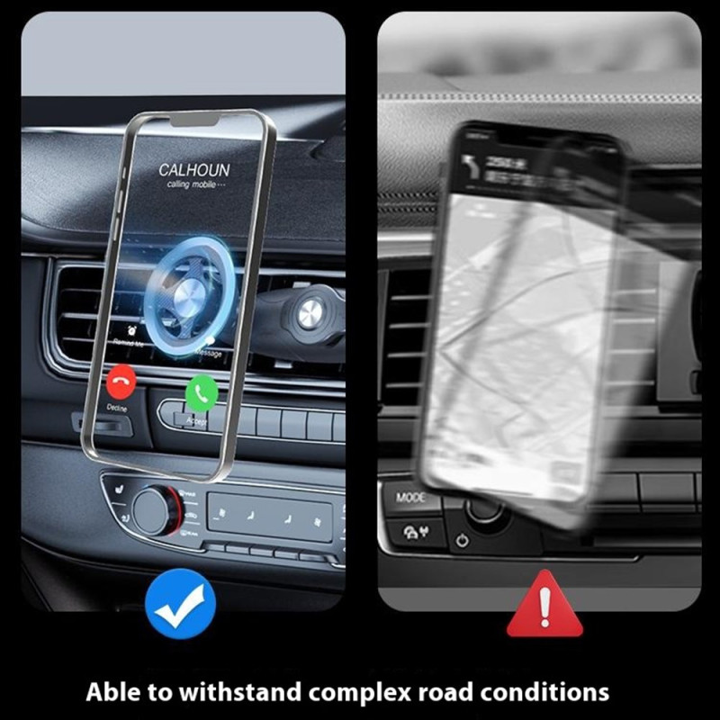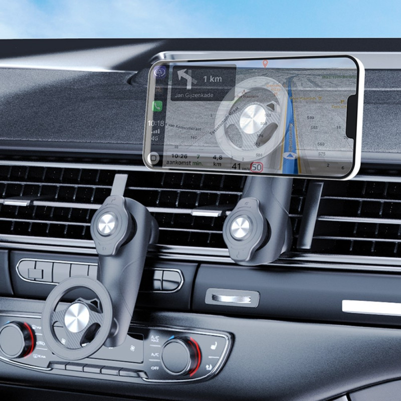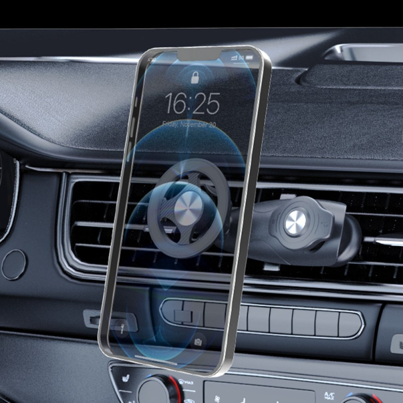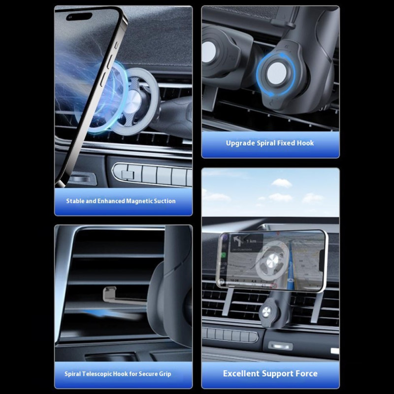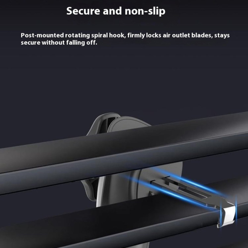 El acceso inmediato a su dispositivo está garantizado por la fuerza magnética, mientras que el gancho asegura una fijación estable a la rejilla. Este soporte utiliza potentes imanes para una sujeción segura y permite manejarlo fácilmente con una sola mano. Su brazo extendido ofrece flexibilidad para ajustar con precisión el ángulo de visión. El soporte trasero, con su robusto gancho, se fija firmemente a las aletas de ventilación, proporcionando una estabilidad extra incluso en carreteras con baches. El revestimiento de silicona protege el teléfono y evita que resbale.
