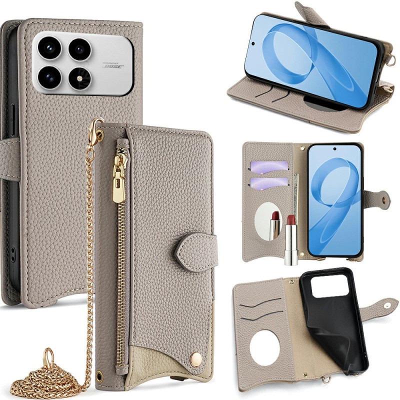 Descubre nuestra funda cartera multifunción para Xiaomi Poco F8 Pro. Con un elegante diseño de cola de pez irregular, combina protección premium y practicidad con sus compartimentos para tarjetas, espejo integrado y bandolera con cadena.