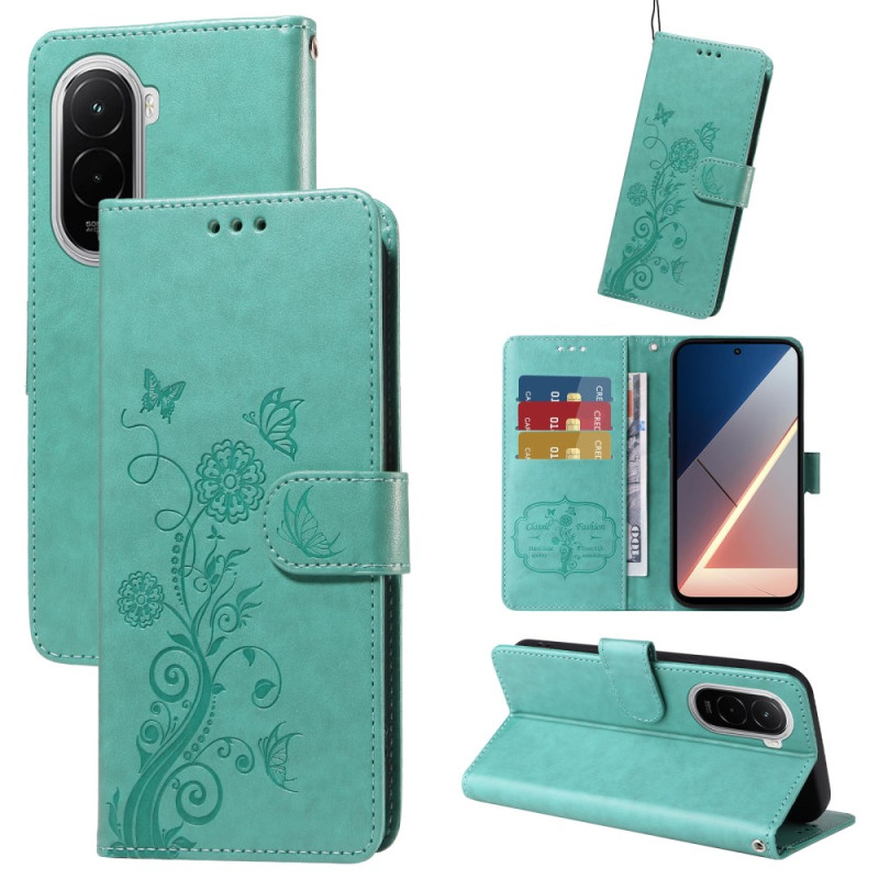 Étui élégant en cuir PU avec impression papillons et fleurs pour votre Xiaomi Poco M7 4G. Fonction portefeuille avec emplacements pour cartes, support mains libres intégré et dragonne pratique. Protection complète contre les chocs et rayures.