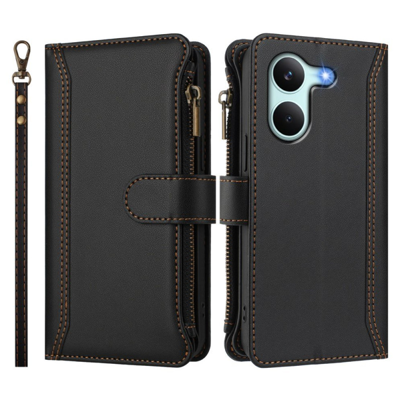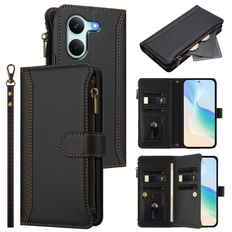 Con 9 ranuras para tarjetas, un bolsillo con cremallera y un soporte integrado, combina practicidad y elegancia para el uso diario.