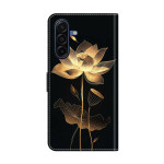 Étui portefeuille élégant pour Samsung Galaxy A37 5G orné d'un motif lotus doré raffiné. Conception flip avec support pliable ajustable, fermeture magnétique sécurisée, 2 emplacements pour cartes et compartiment pour billets. Protection complète...