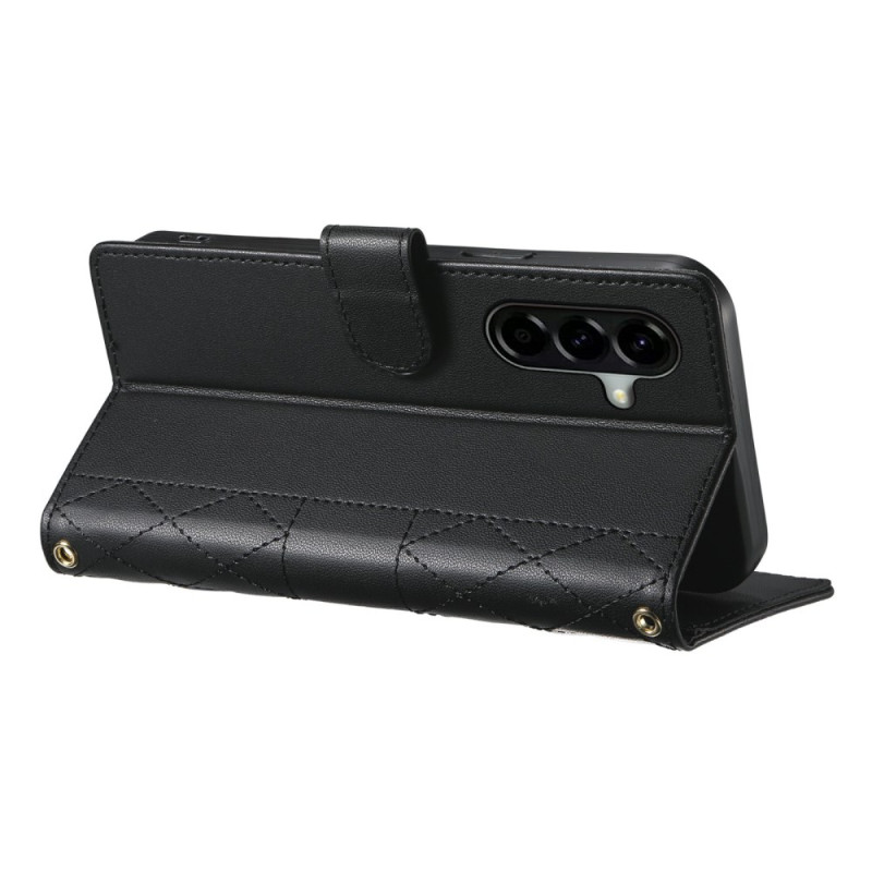 Descubra la funda cartera de piel de PU para Samsung Galaxy A57 5G con elegante diseño acolchado. Dispone de 3 ranuras para tarjetas, un bolsillo para billetes y una función de soporte integrada. Incluye dos correas desmontables para transportarla cómodamente.