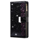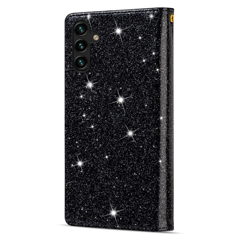 Elegante funda monedero para Samsung Galaxy A57 5G con diseño de cielo estrellado grabado a láser y purpurina. Dispone de ranuras para tarjetas, bolsillo con cremallera y práctica colgante de mano para un transporte seguro.