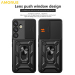 Protege tu Samsung Galaxy A57 5G con esta resistente funda con soporte giratorio y tapa deslizante para el objetivo. Resistencia a impactos de grado militar, superficie antiarañazos y placa magnética integrada para montaje en coche.