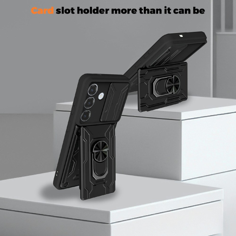 Protege tu Samsung Galaxy A57 5G con esta funda multifunción con soporte metálico plegable, tarjetero integrado y protección deslizante para la cámara. Compatible con soportes magnéticos para coche.