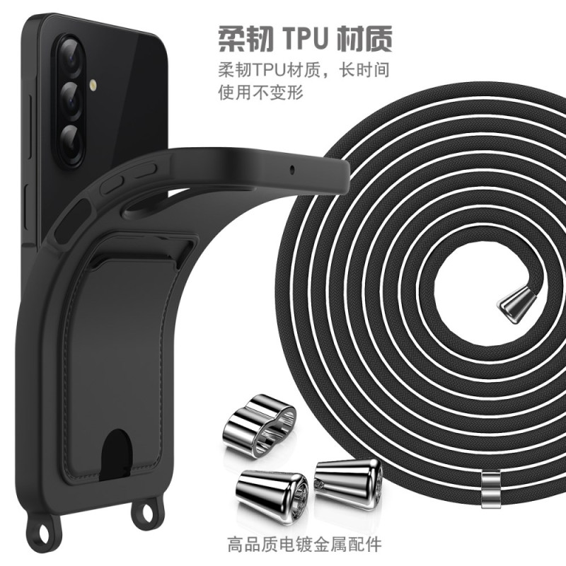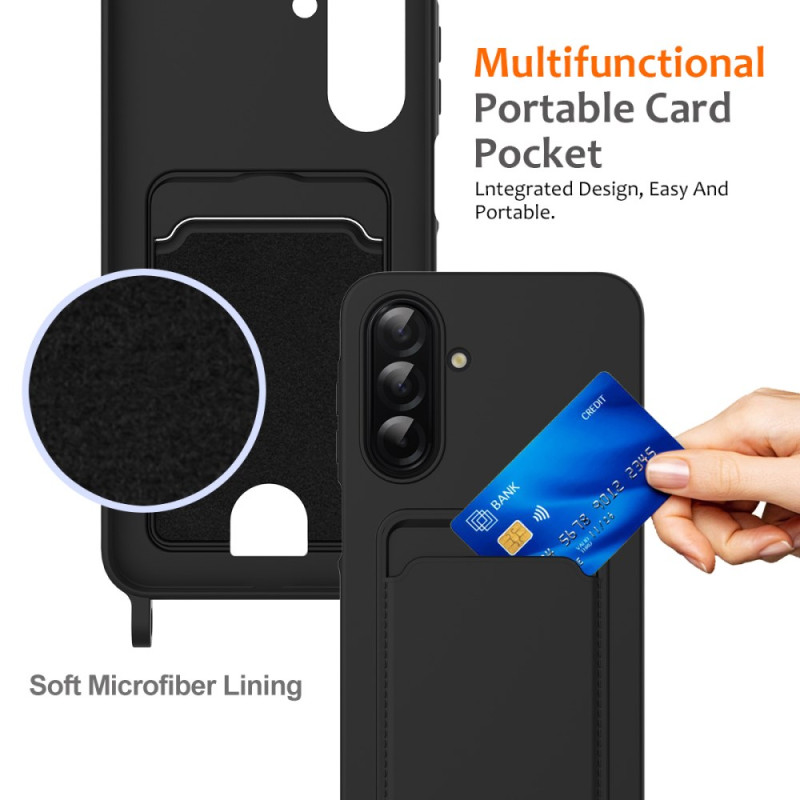 Funda de silicona líquida ultrasuave para Samsung Galaxy A57 5G. Diseño práctico con tarjetero integrado y cordón ajustable de 160 cm. Protección reforzada de la cámara con bordes elevados. Fácil instalación y extracción sin rayar el teléfono.