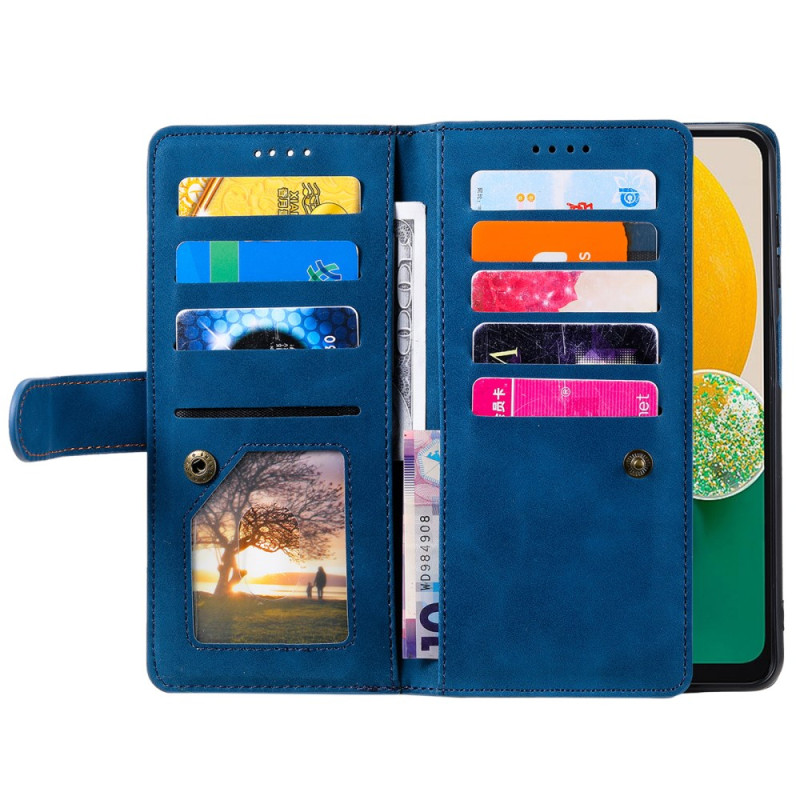 Descubra nuestra funda multifunción para Samsung Galaxy S25 5G. Fabricada en piel PU de alta calidad, ofrece una protección completa a la vez que sirve de práctica cartera con 9 ranuras para tarjetas y cierre de cremallera.