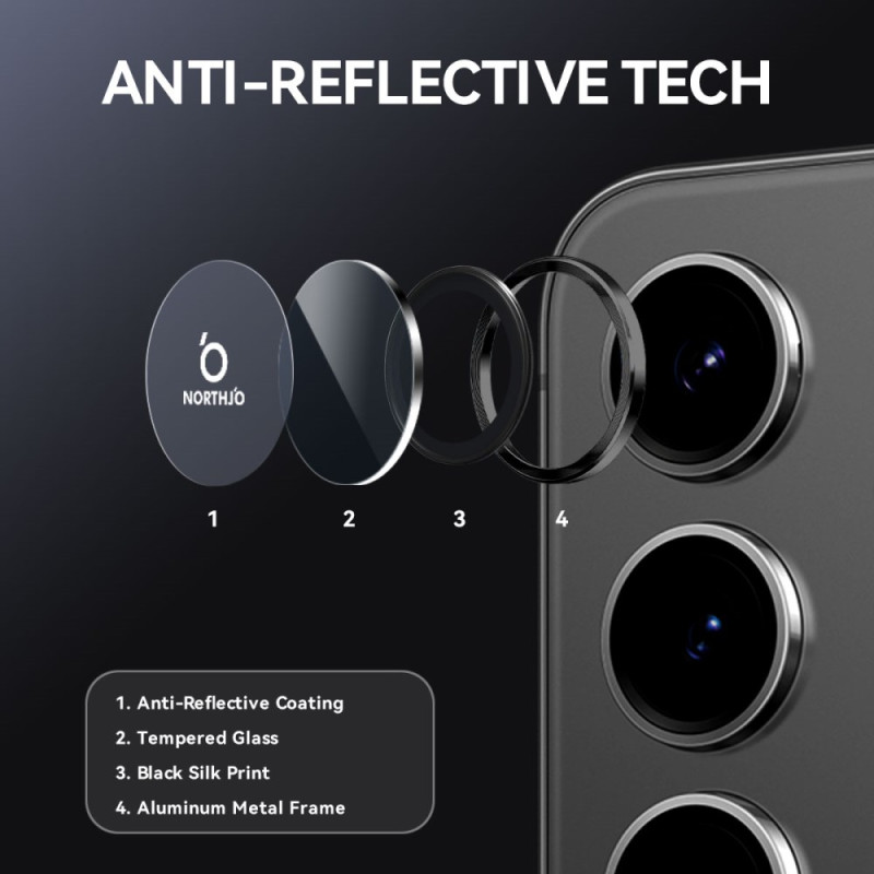 Descubre el protector de lente NORTHJO para Samsung Galaxy S25 FE. Con su elegante diseño de aluminio veteado en CD y cristal templado 9H, ofrece una protección eficaz contra arañazos y golpes.