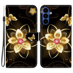 Elegante funda cartera con motivo de flores doradas para Samsung Galaxy S26 5G. Diseño de solapa con función de soporte, almacenamiento de tarjetas y colgante de mano desmontable. Protección completa con cierre magnético seguro para su teléfono.