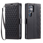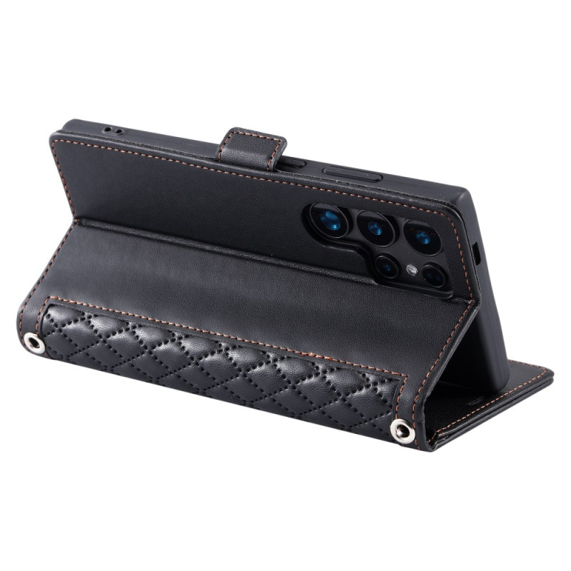 Elegante funda cartera con textura de diamante para Samsung Galaxy S26 Ultra. Con 3 ranuras para tarjetas, 1 compartimento para efectivo y una práctica colgante de mano. Soporte de visualización integrado para un uso manos libres óptimo.
