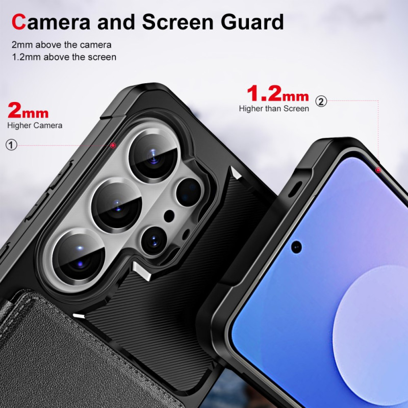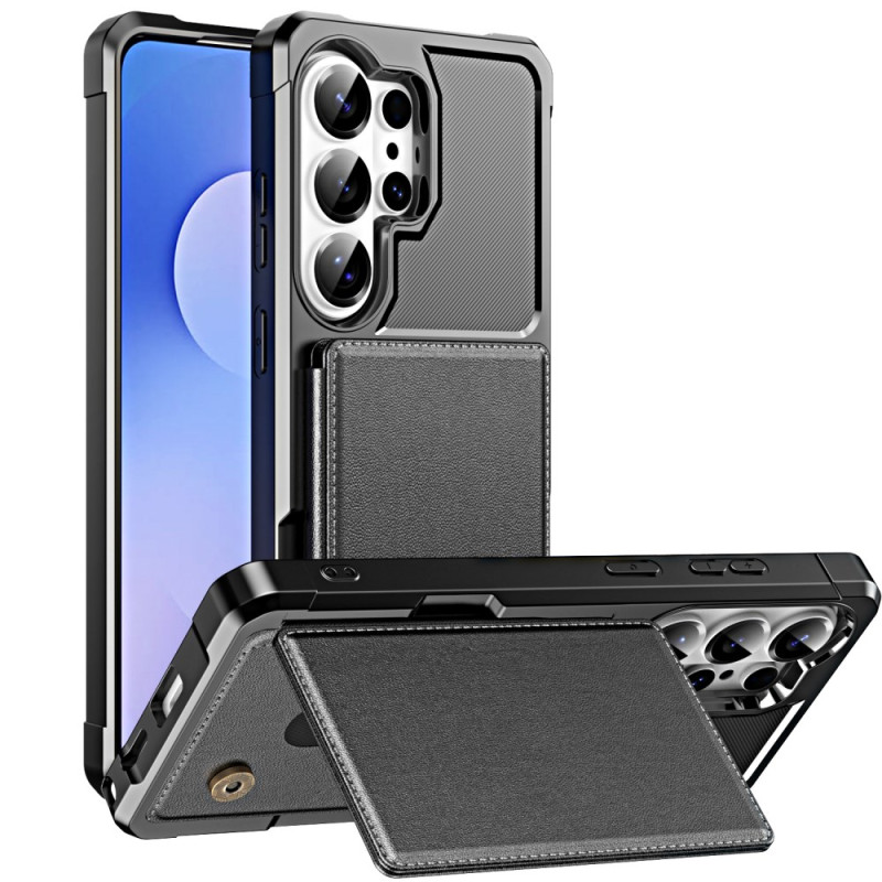 Protégez votre Samsung Galaxy S26 Ultra avec style grâce à cet étui multifonction en cuir et TPU. Doté d'un porte-cartes intégré pouvant accueillir jusqu'à 4 cartes, d'un support pliable pour visionnage mains libres et de coins renforcés pour une protection optimale contre les chocs.