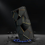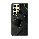 Étui portefeuille élégant en cuir PU pour Samsung Galaxy S26 Ultra. Design sophistiqué noir et or avec bordures biseautées. Support pliable ajustable, fermeture magnétique sécurisée, 2 emplacements pour cartes et compartiment à billets. Protection complète contre les chocs et rayures.