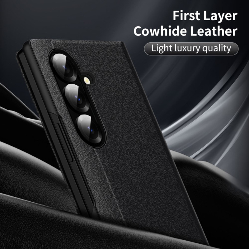 Descubre nuestra elegante funda de piel para Samsung Galaxy Z Fold 7 5G. Con una ventana inteligente para un acceso rápido, un práctico tarjetero y una función de soporte, combina funcionalidad y protección.