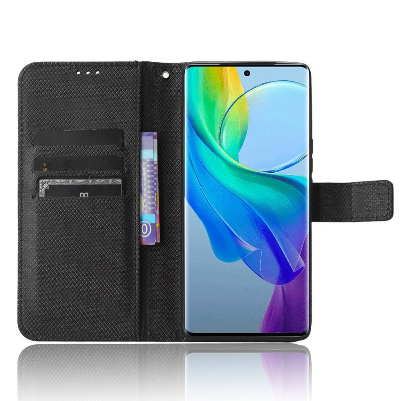 Elegante funda monedero con sofisticada textura de diamante para tu Vivo V29 Lite 5G. Incluye ranuras para tarjetas, un bolsillo para billetes y un soporte plegable integrado para tener las manos libres.