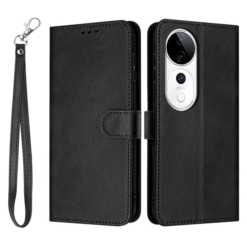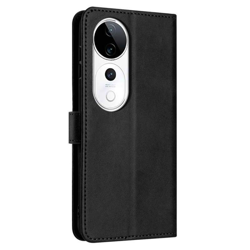 Elegante funda monedero en piel de PU texturizada para tu smartphone Vivo V40 Lite 5G. Protección total con textura de grano de becerro, función de soporte ajustable y cierre magnético seguro. Incluye 3 ranuras para tarjetas y un bolsillo para billetes.