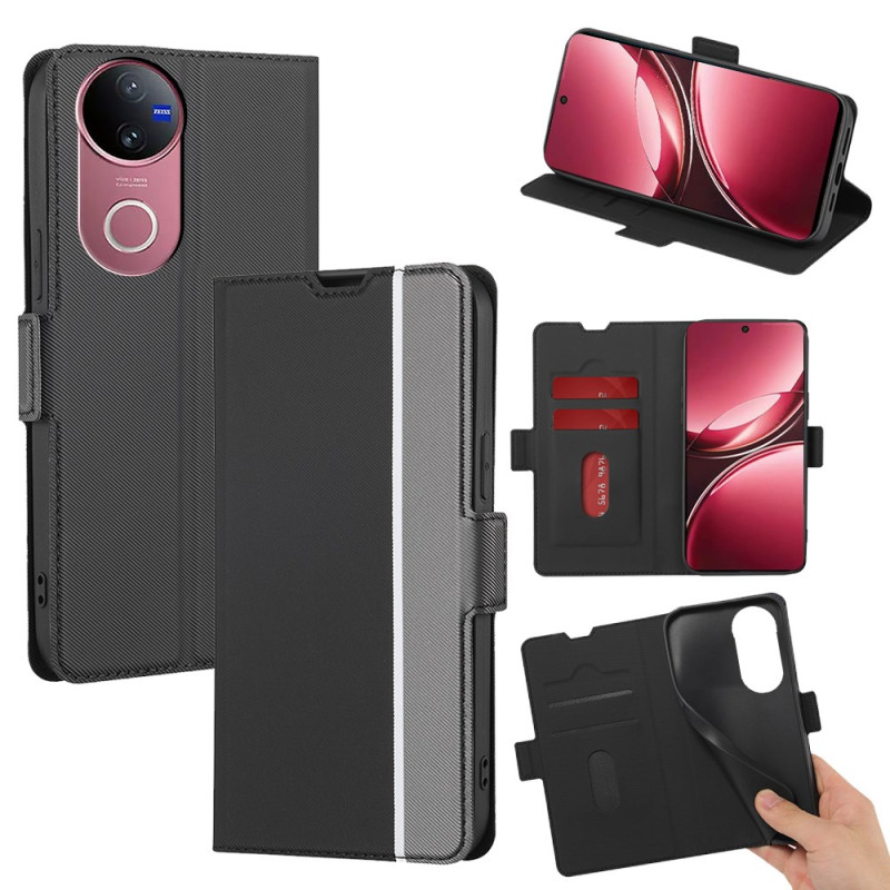 Descubre esta elegante funda de piel PU texturizada para Vivo V50 5G. Con dos ranuras para tarjetas, soporte manos libres y un cierre magnético seguro, combina un estilo refinado con una protección completa para el uso diario.
