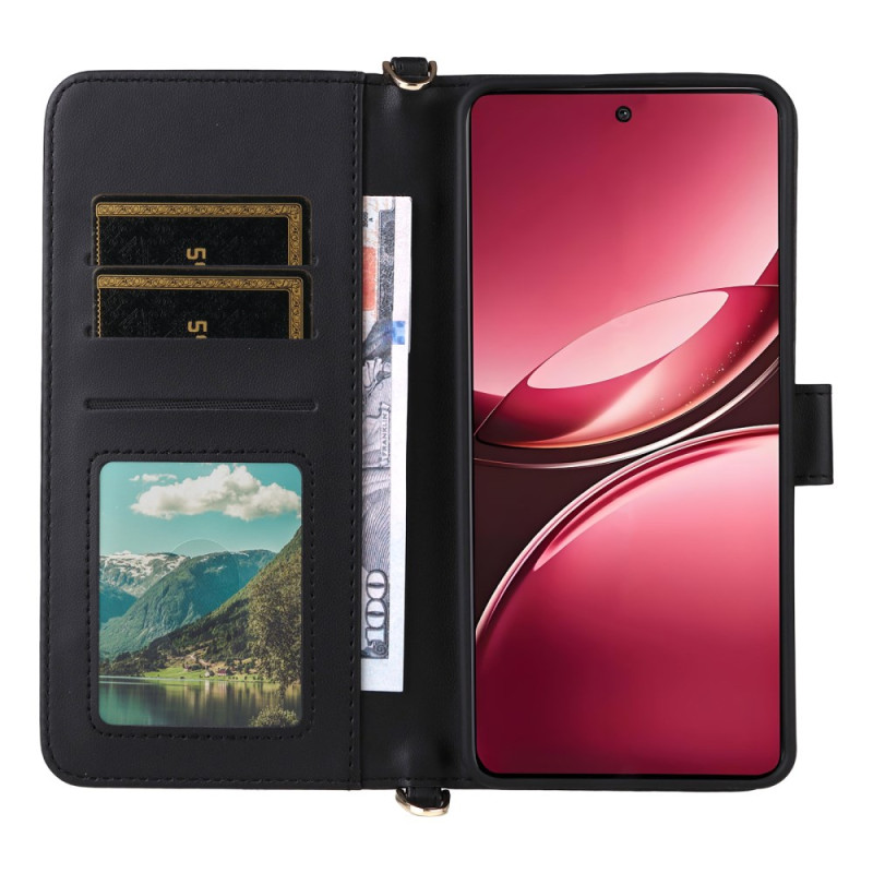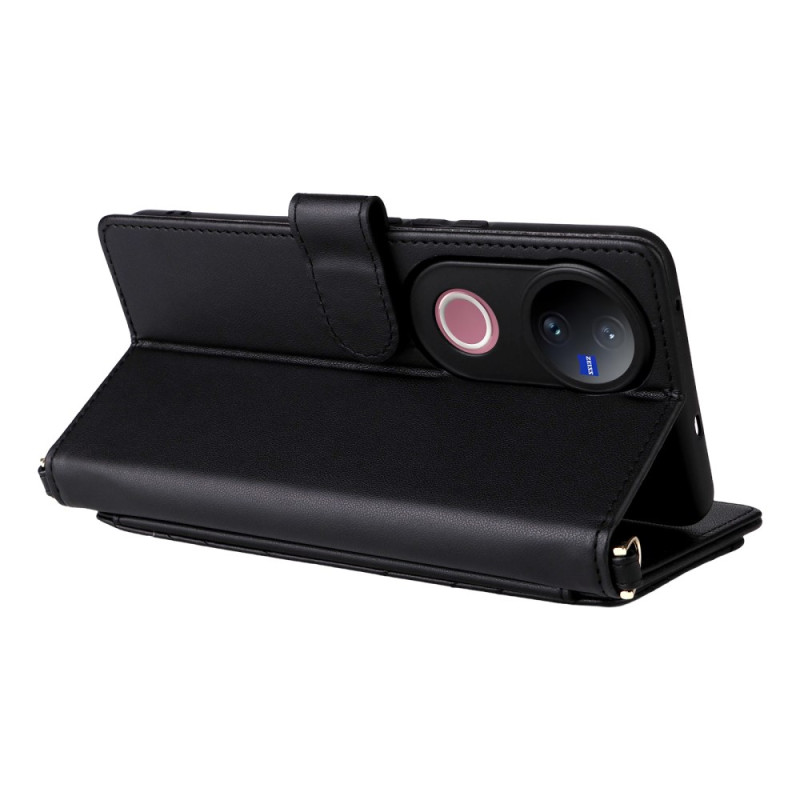 Elegante funda tipo cartera para el Vivo V50 5G con soporte ajustable, 6 ranuras para tarjetas y cierre magnético seguro. Viene con colgante de mano desmontable y colgante de hombro ajustable para un transporte diario versátil y práctico.