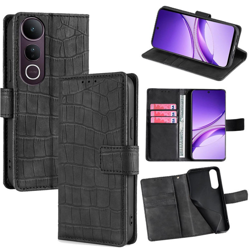 Descubre esta elegante funda para Vivo V50 Lite 5G en piel de PU texturizada estilo cocodrilo. Con 3 ranuras para tarjetas y un soporte plegable, combina un estilo lujoso con la practicidad diaria para una protección óptima de tu smartphone.