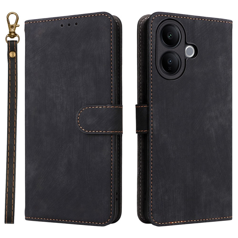 Funda monedero multifunción de cuero PU para Vivo V60 Lite 5G. Protección RFID integrada, 3 ranuras para tarjetas, soporte manos libres y cierre magnético. Combina estilo, seguridad y practicidad diaria con la colgante de mano incluida.