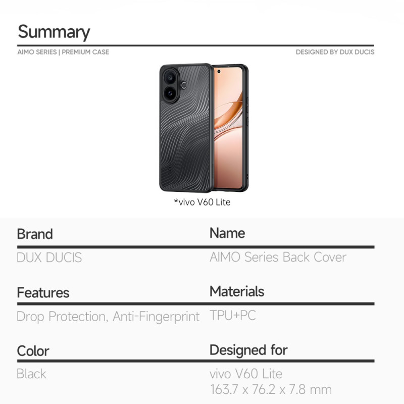 Protege tu Vivo V60 Lite 5G con estilo con la funda DUX DUCIS Aimo. Su construcción de dos capas ofrece una sólida protección contra caídas desde una altura de hasta 1,2 m y cuenta con la certificación SGS. Elegante diseño mate de líneas fluidas y cómodo agarre.