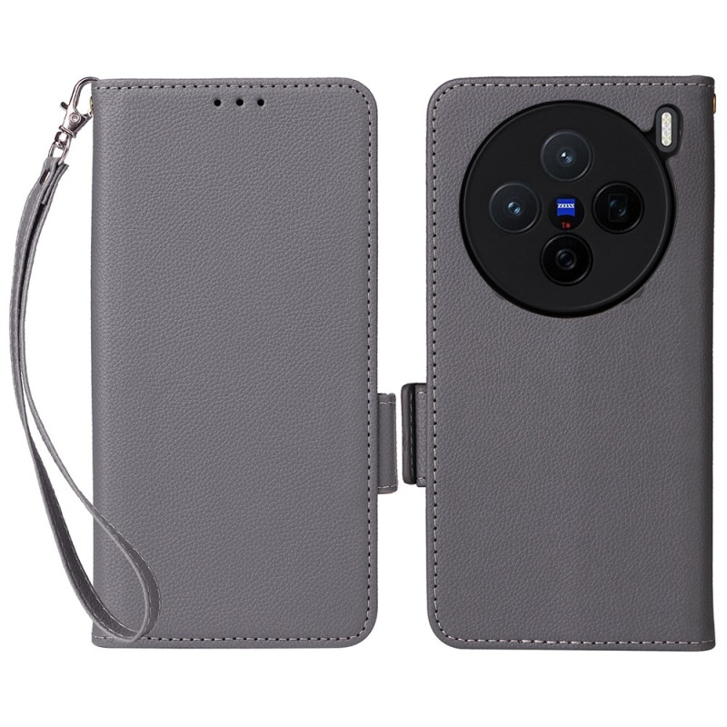 Elegante funda monedero en piel de PU con textura de lichi para Vivo X200 5G. Incluye ranuras para tarjetas, soporte manos libres y práctica colgante de mano. Protección completa con cierre magnético seguro para un uso diario óptimo.